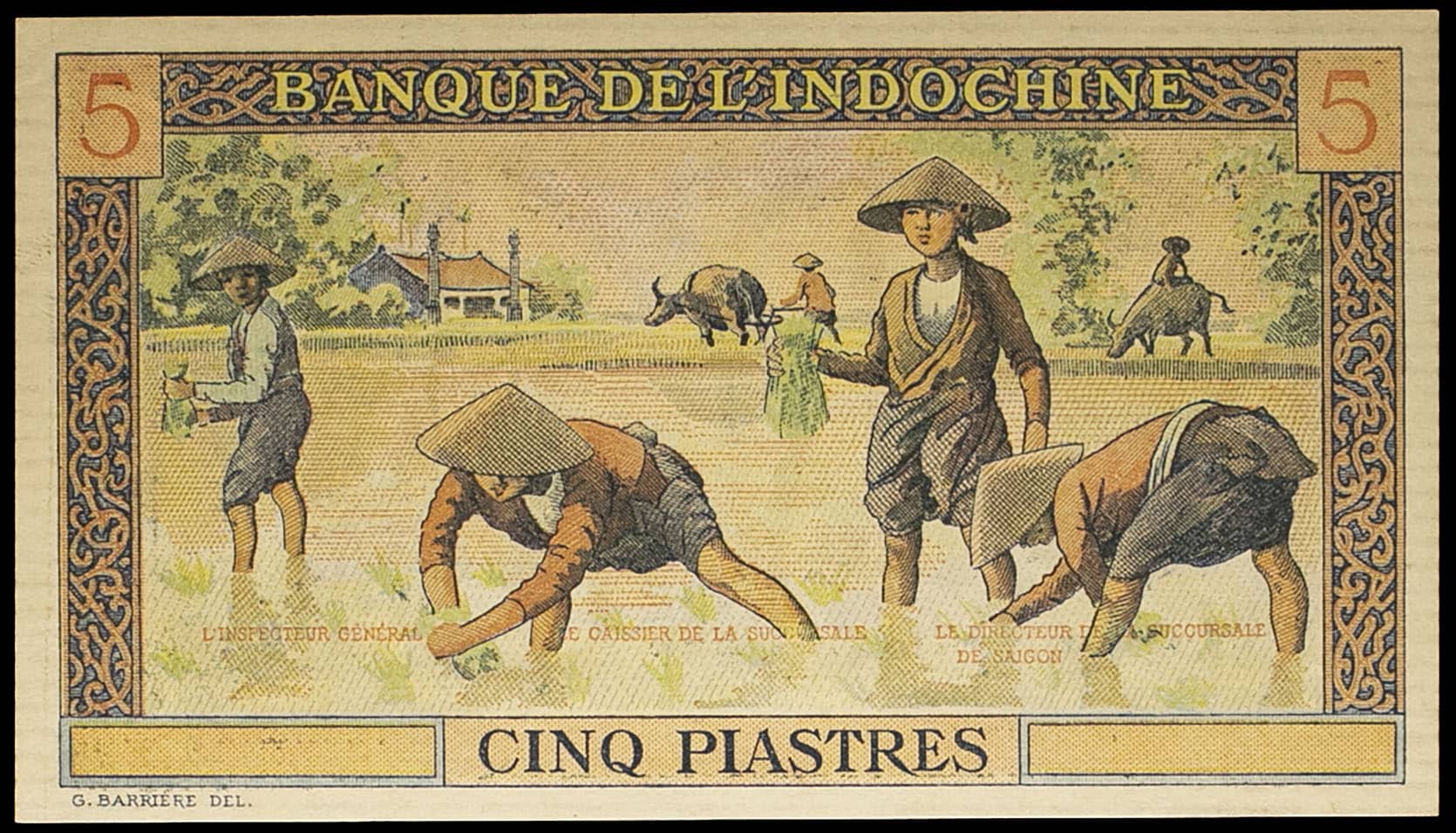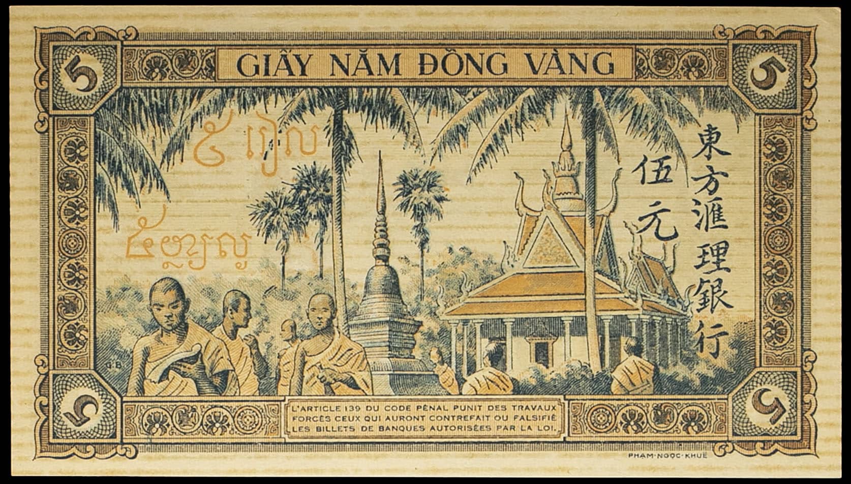 - FRENCH INDOCHINA 5 piastres non émis (Remainder), impression japonaise ND (1945).