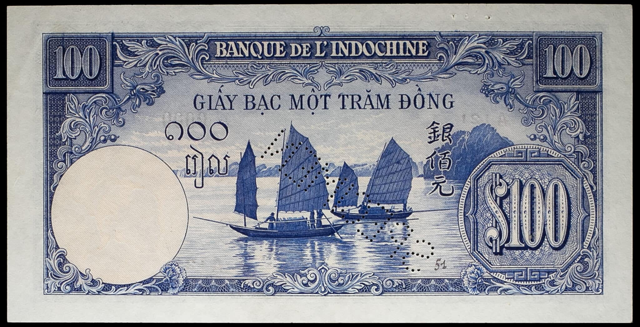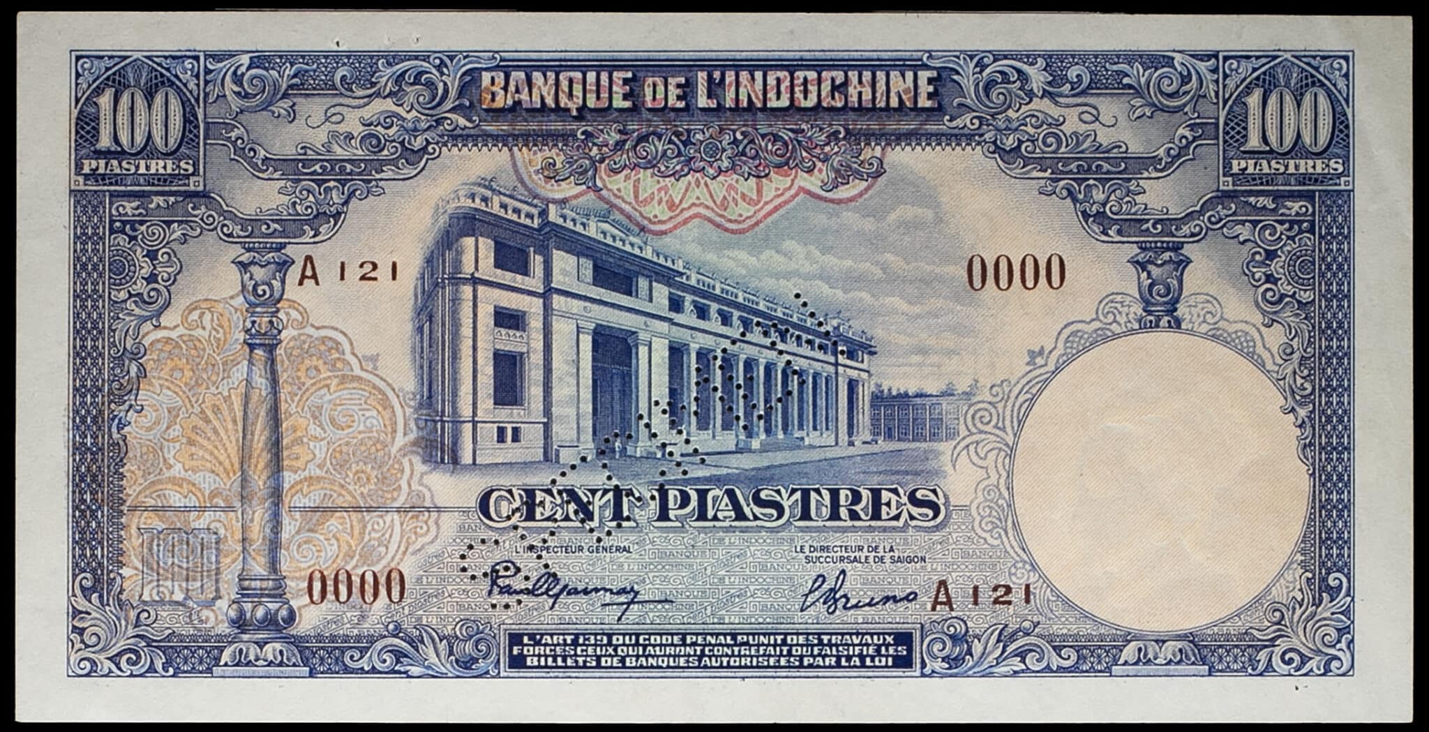 - FRENCH INDOCHINA 100 piastres impression US type “bleu et rose” (SPÉCIMEN) ND (1946).