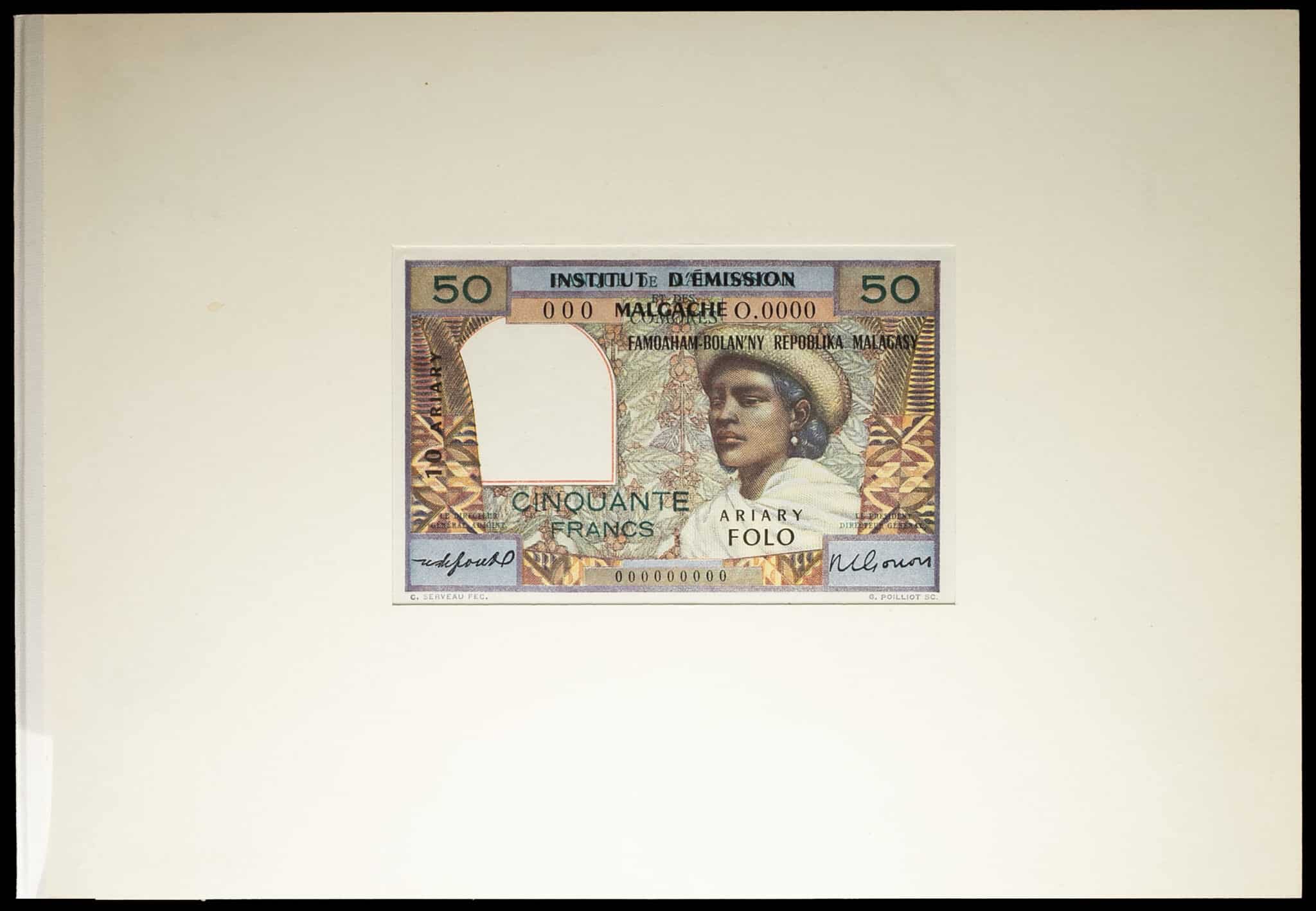 - Épreuve de recto de 10 ariary surchargé sur 50 francs type “femme Betsileo” (FRONT PROOF) - Institut d’Émission Malgache ND (1961).