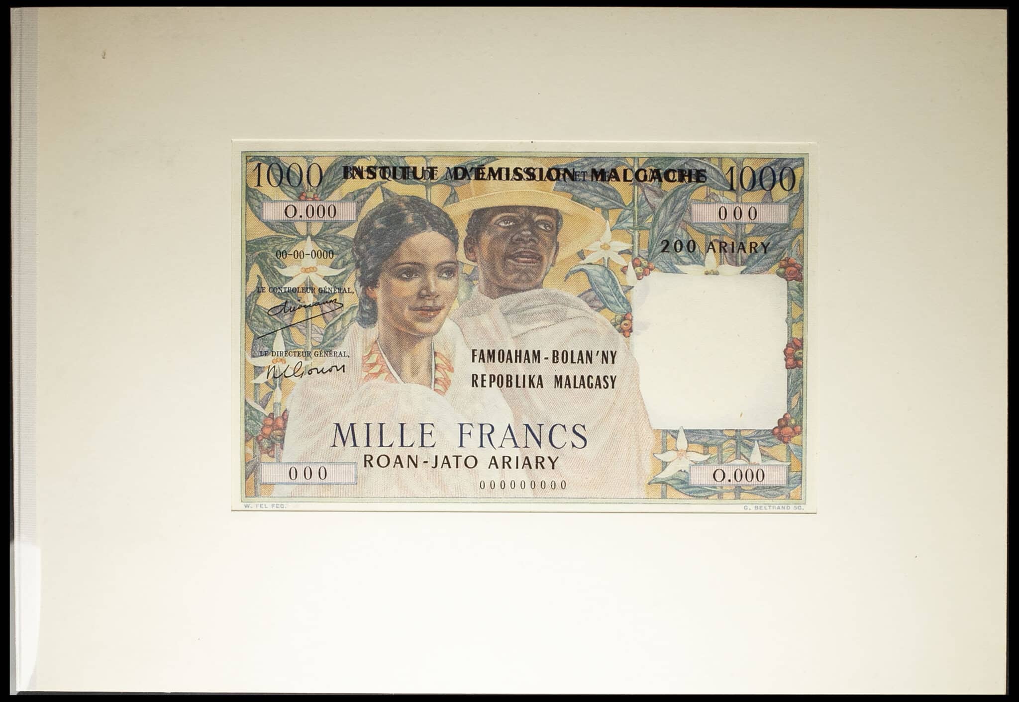 - Épreuve de recto de 200 ariary surchargé sur 1000 francs type “couple indigène des Hauts Plateaux” (FRONT PROOF) - Institut d’Émission Malgache ND (1961).