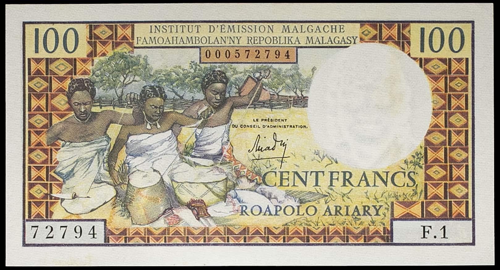 - 100 francs - 20 ariary type “fileuses de coton” ND (1964).