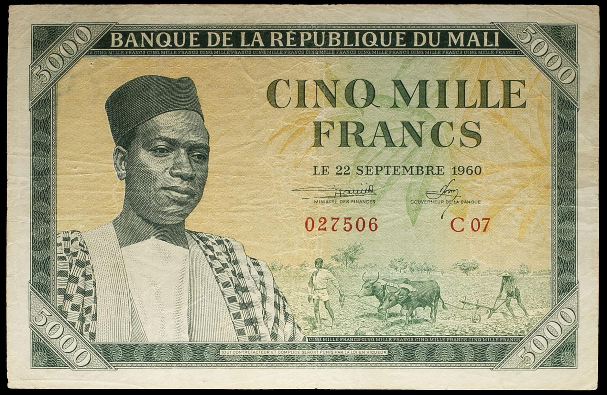 - 5000 francs avec le portrait du président Mobido Keita 22 septembre 1960.