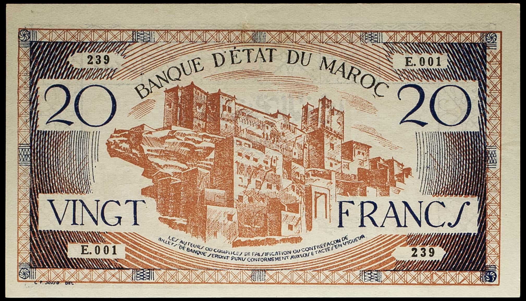 - MOROCCO 20 francs type “Imprimeries Réunies (Casablanca)” ND (1943).