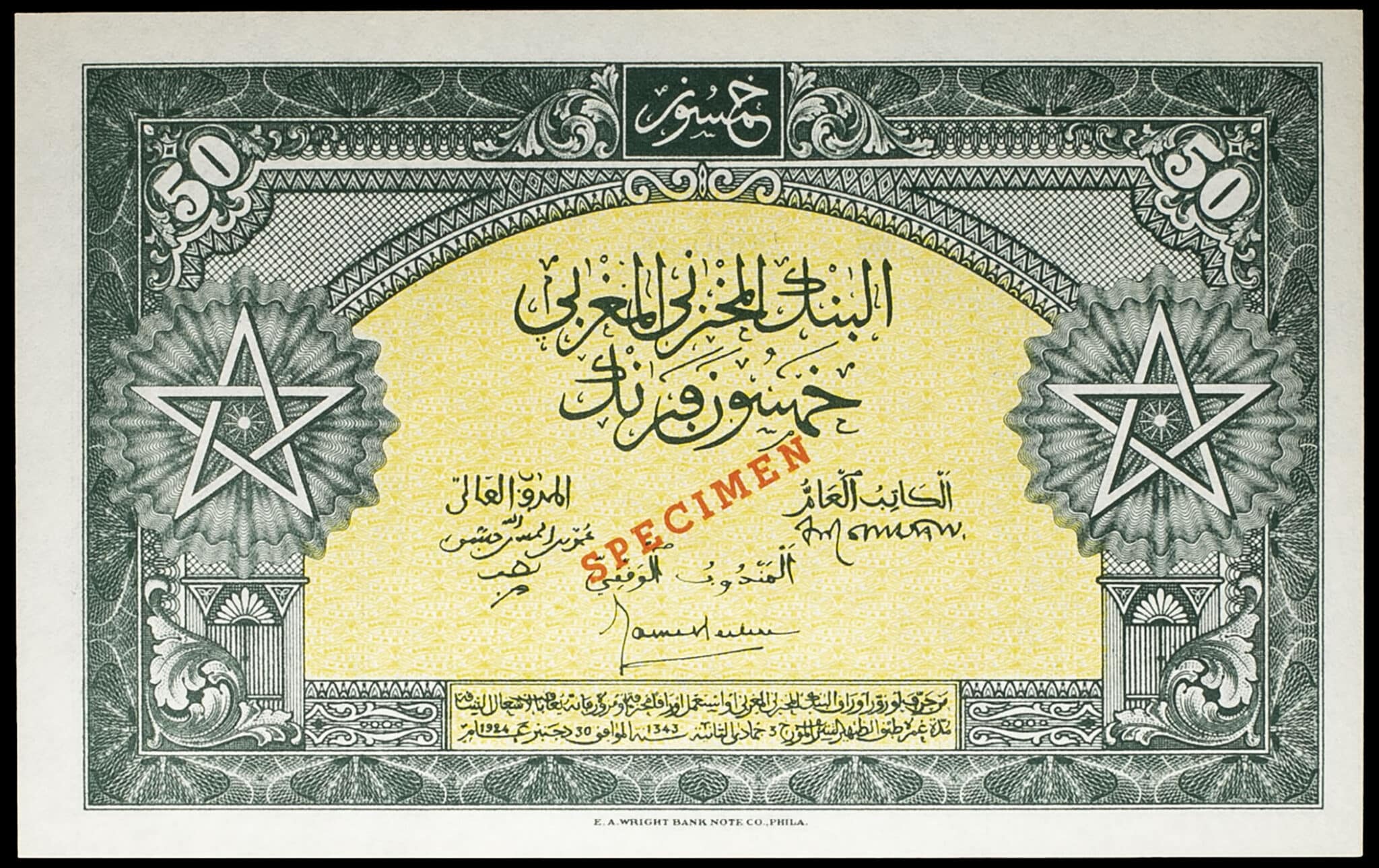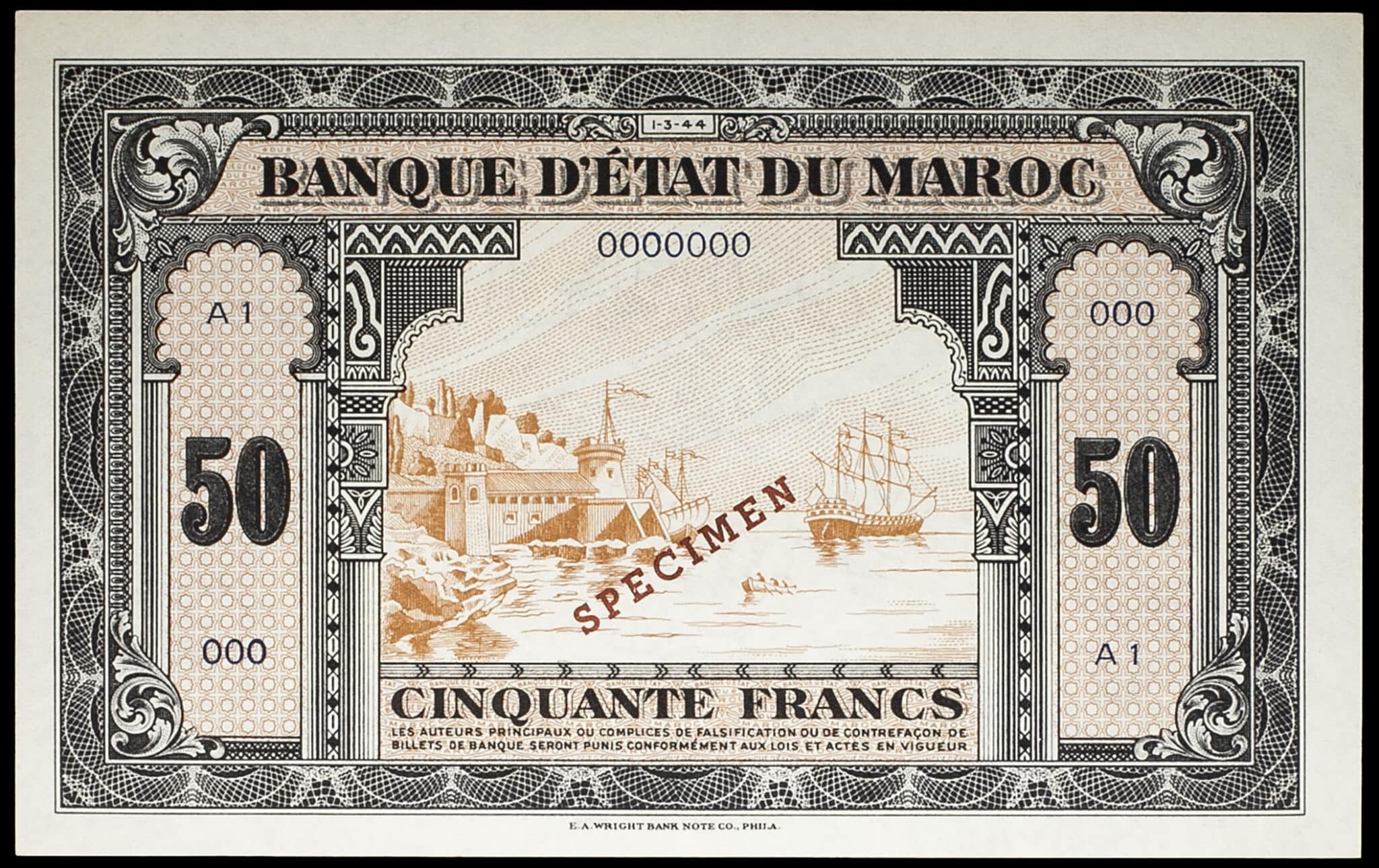 - MOROCCO 50 francs (SPÉCIMEN), impression US (deuxième émission) 1-3-1944.