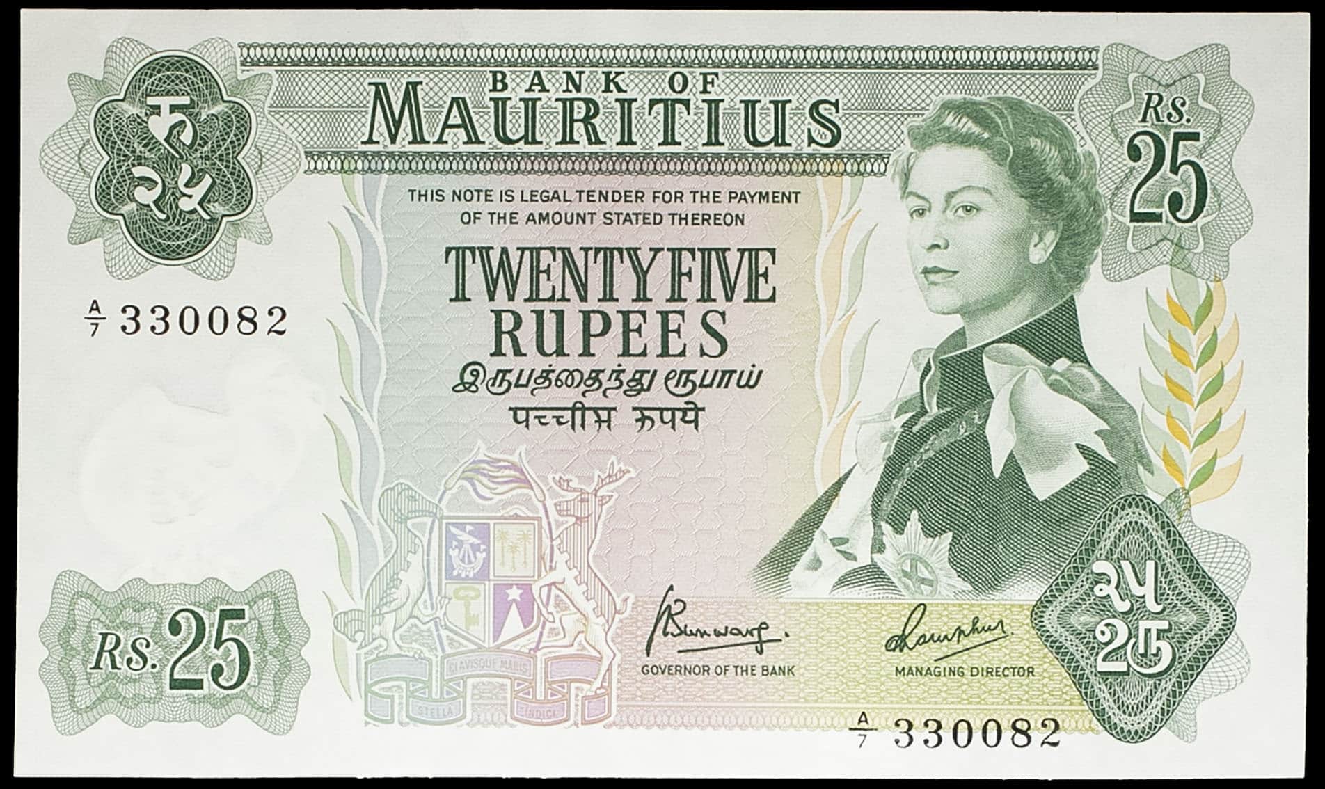 - MAURITIUS 25 rupees avec le portrait de la reine Élisabeth II ND (1967).