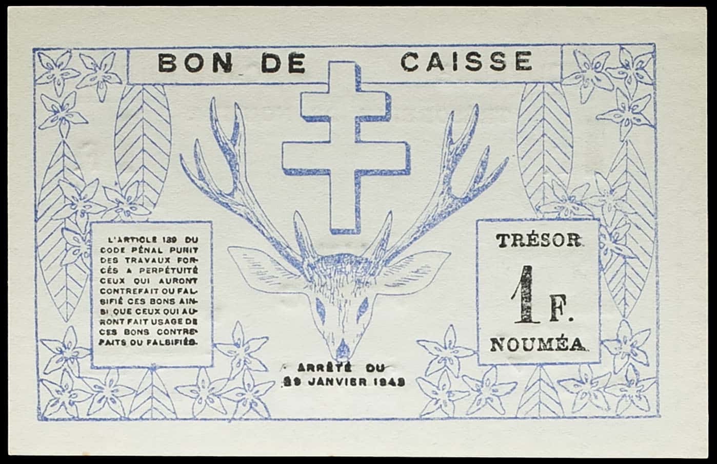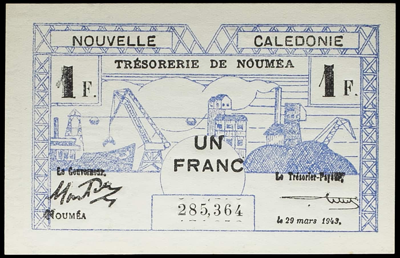 - NEW CALEDONIA 1 franc type “Trésorerie de Nouméa”, deuxième émission 29 mars 1943.