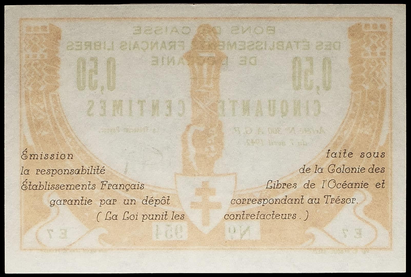 - FRENCH POLYNESIA / FRENCH OCEANIA Bon de 50 centimes type “orange et vert” - Établissments Français libres de l’Océanie 7 avril 1942.