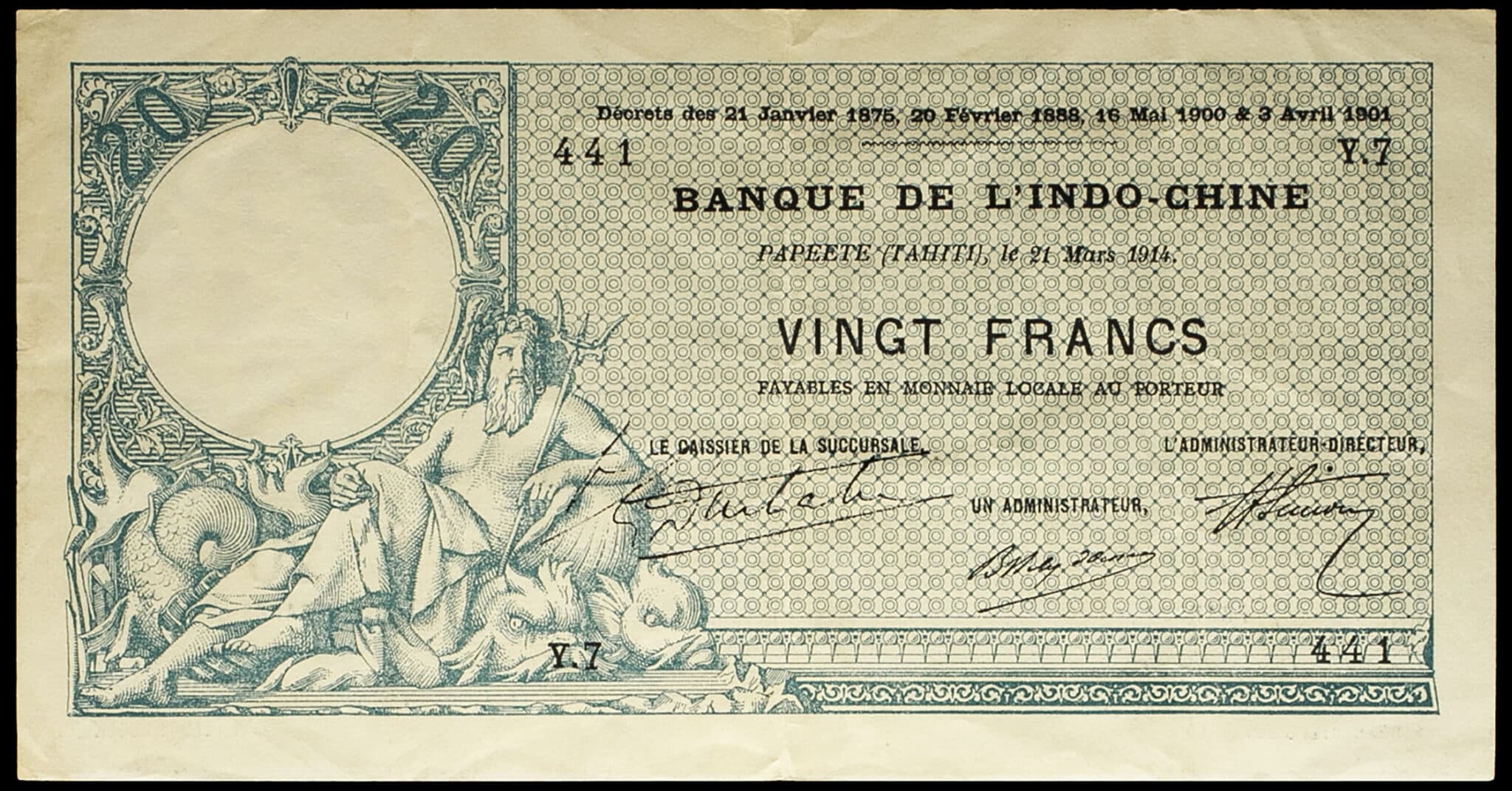 - FRENCH POLYNESIA / TAHITI 20 francs type “vert”, avec décrets - Banque de l’Indo-Chine 23 mars 1914.