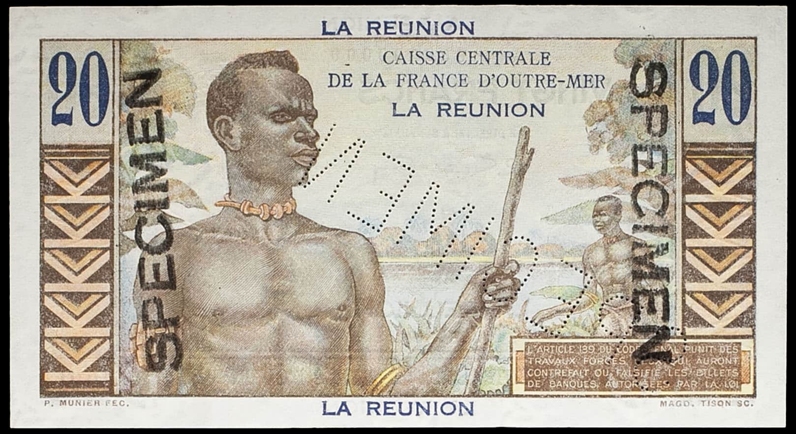 - REUNION 20 francs type “Émile Gentil” (SPÉCIMEN) ND (1946).