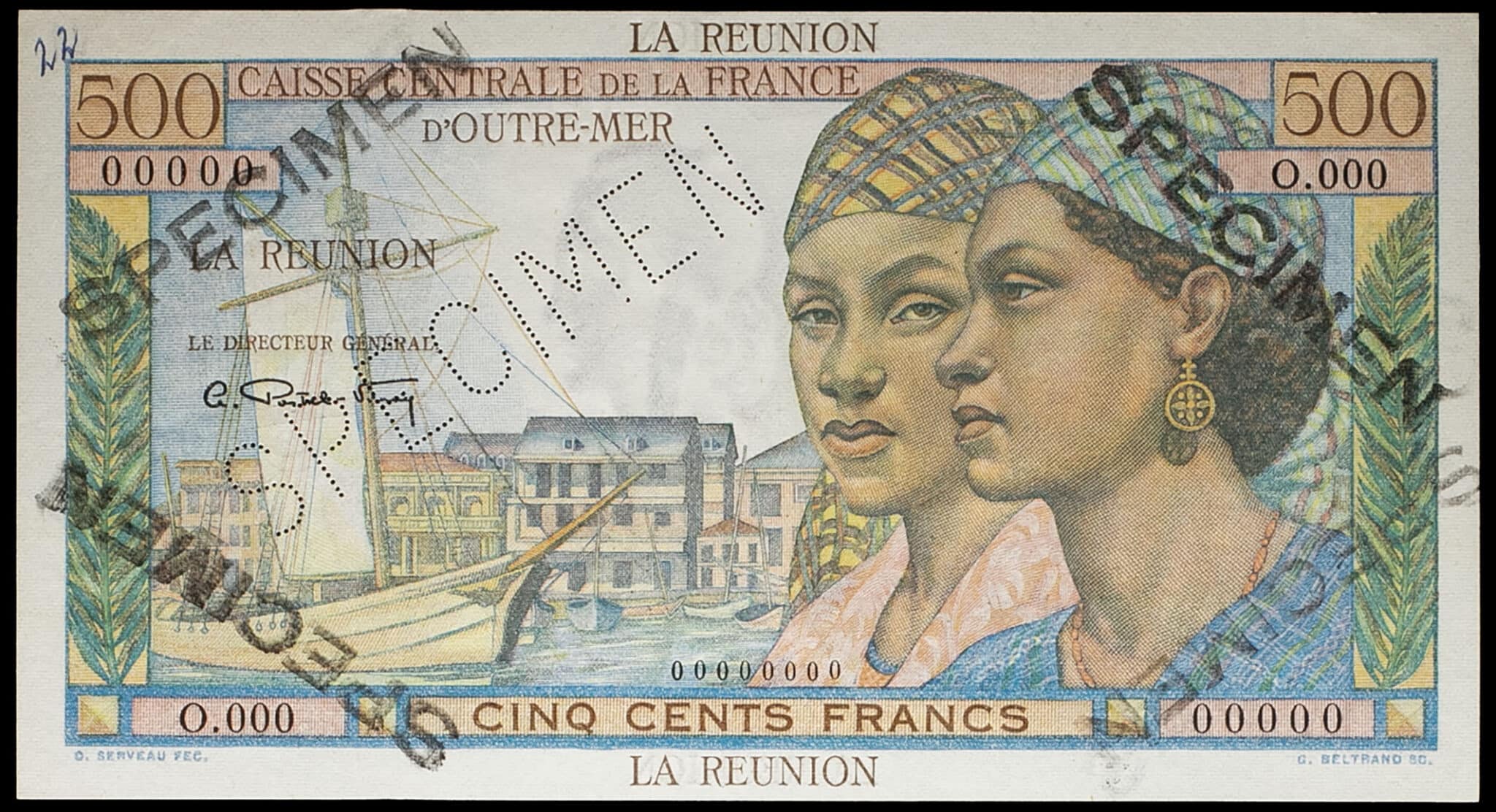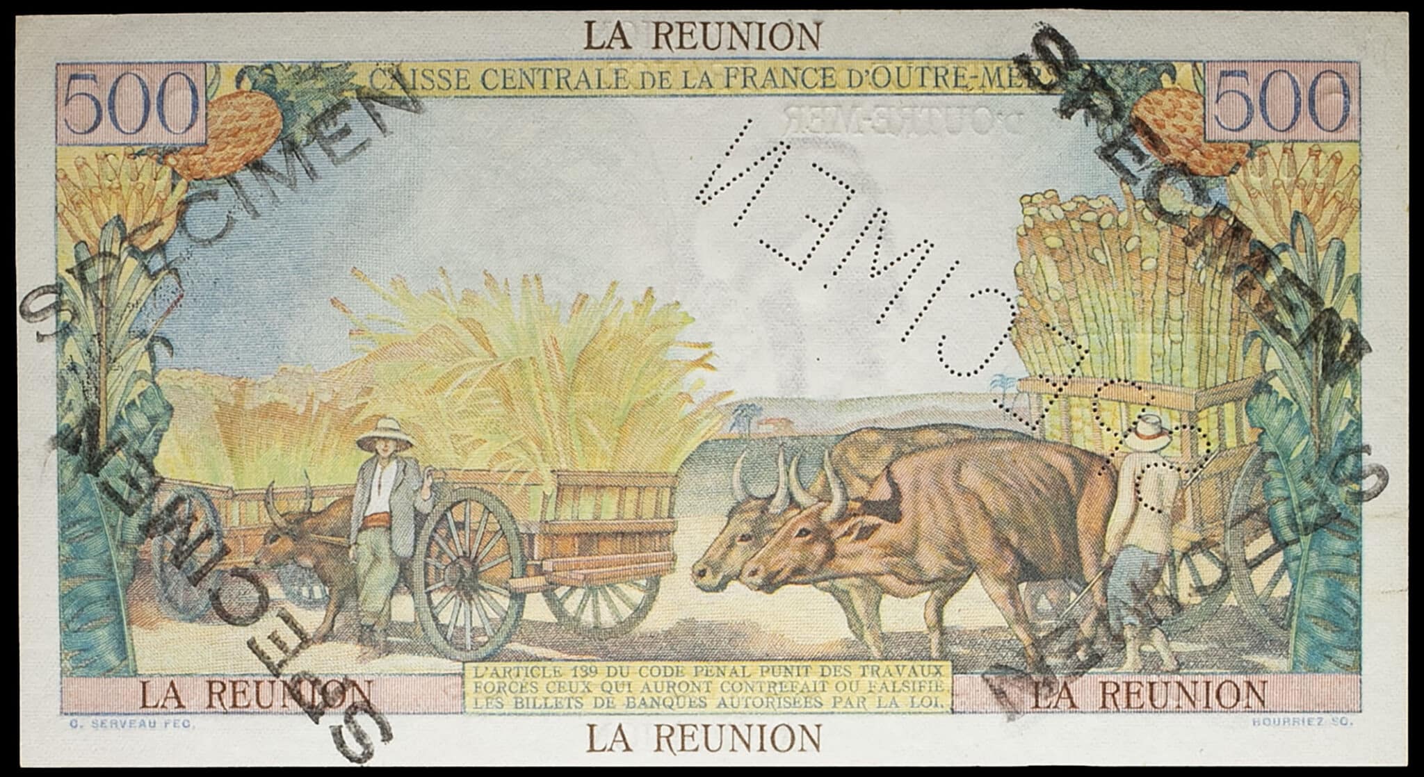 - REUNION 500 francs type “Pointe-à-Pitre” (SPÉCIMEN) ND (1946).