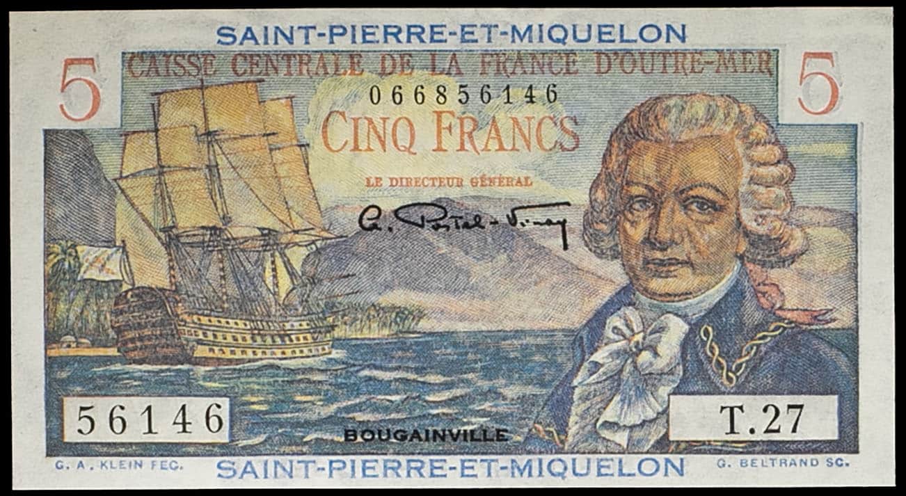 - SAINT PIERRE AND MIQUELON 5 francs type “Bougainville” ND (1946).