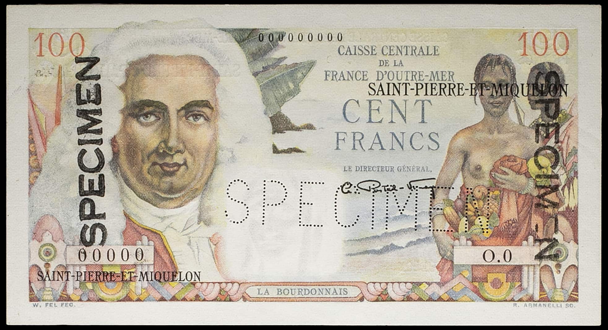 - SAINT PIERRE AND MIQUELON 100 francs type “La Bourdonnais” (SPÉCIMEN) ND (1946).