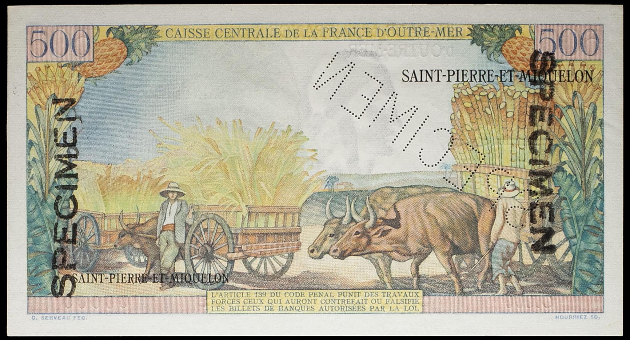 - SAINT PIERRE AND MIQUELON 500 francs type “Pointe-à-Pitre” (SPÉCIMEN) ND (1946).