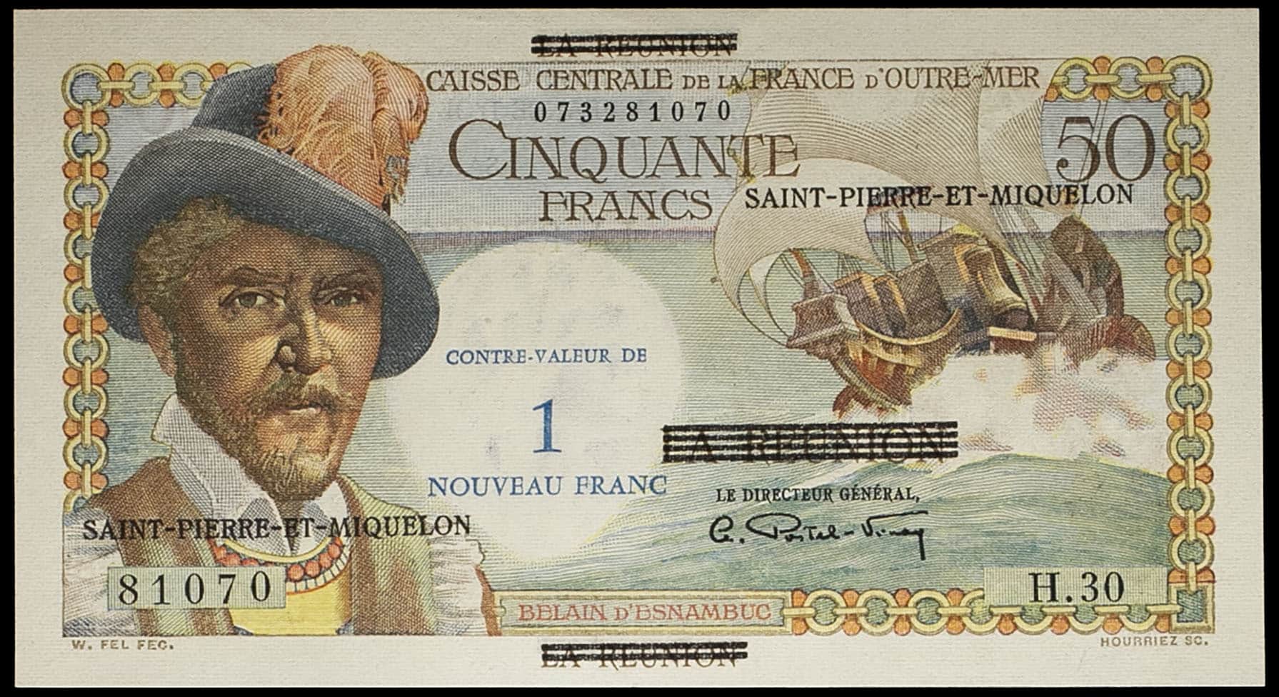 - SAINT PIERRE AND MIQUELON 1 nouveau franc surchargé sur 50 francs type “Belain d’Esnambuc” ND (1960).