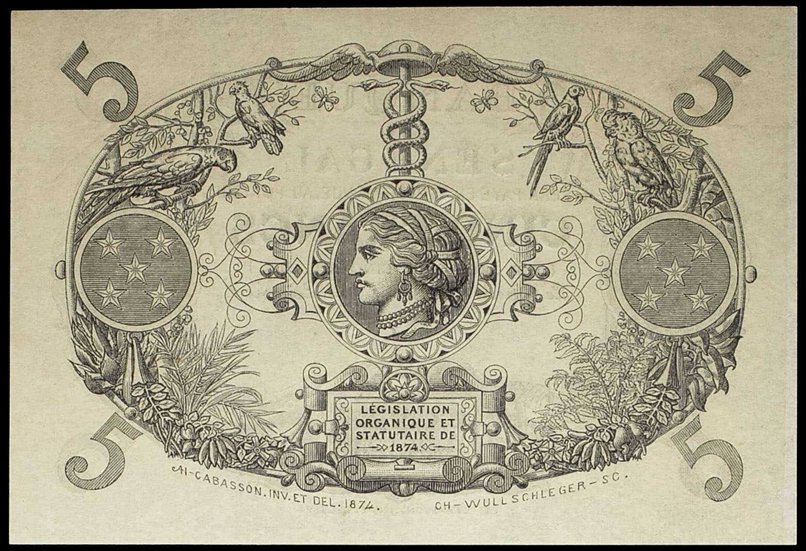- SENEGAL 5 francs bleu type “bleu” dit “Cabasson” non émis (Remainder) 1874.