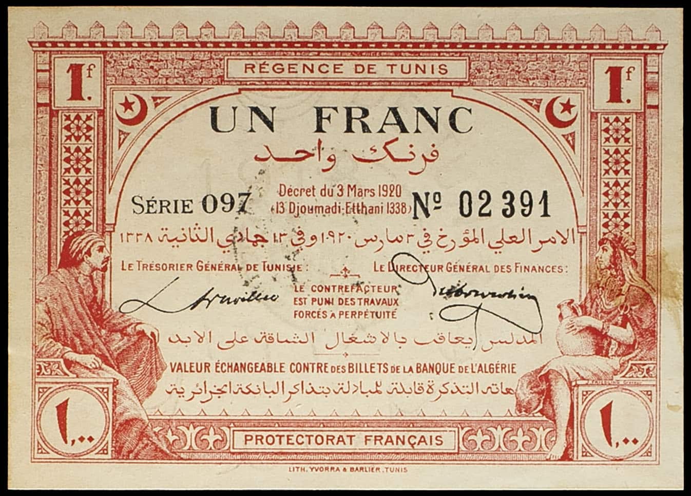 - TUNISIA 1 franc type “Régence de Tunis”, septième émission 3 mars 1920.