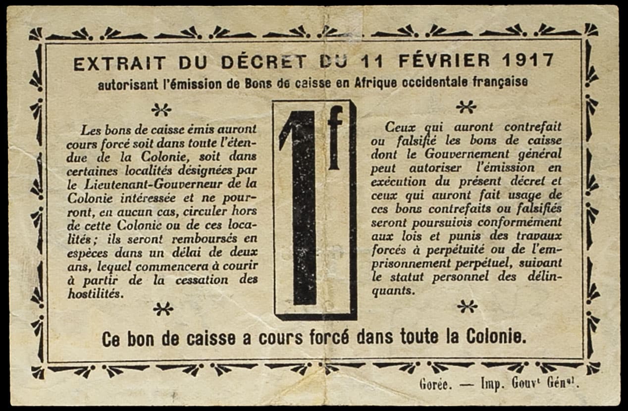 - FRENCH WEST AFRICA 1 franc type “jaune et rouge” - Colonie du Dahomey, Gouvernement général de l’Afrique Occidentale Française 11 février 1917.