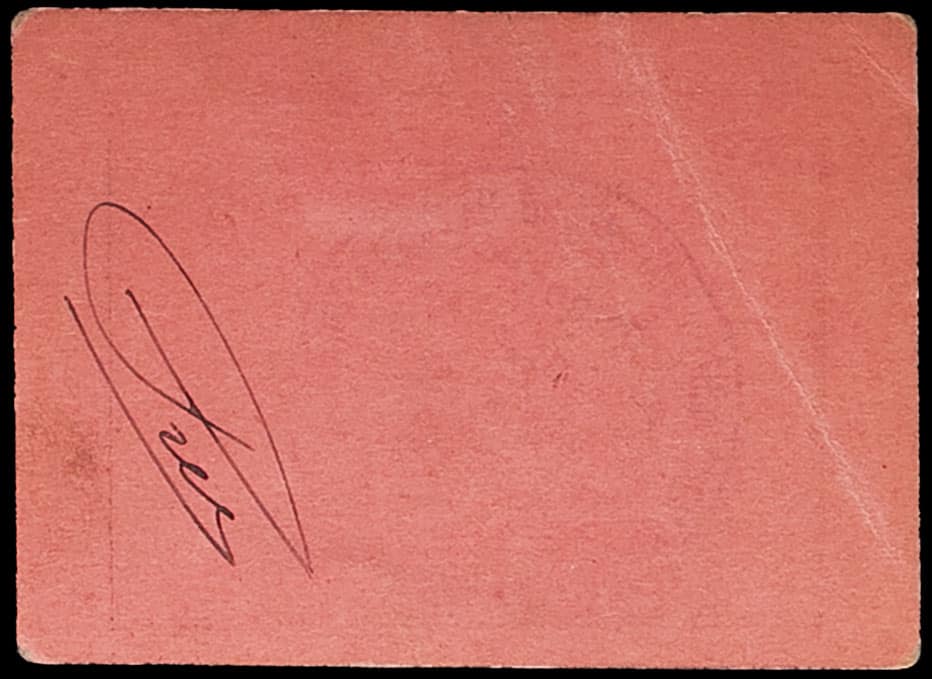 Sans série ni numéro. Impression sur papier carton carmin avec mention “REMBOURSABLE PAR PAYEUR OU CAISSE ANNEXE DE DIRÉ-DAOUA”, avec tampon des chemins de fer de Djibouti (à peine visible) ainsi qu’une signature manuscrite au verso.