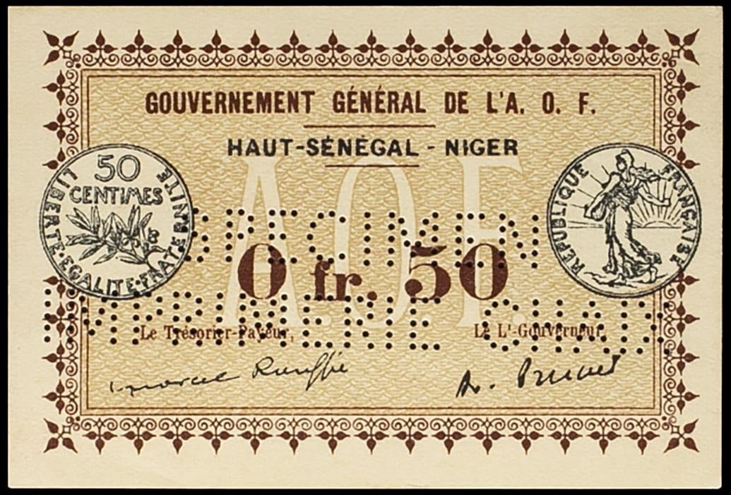 - FRENCH WEST AFRICA 0,50 franc / 50 centimes type “brun” (SPÉCIMEN) - Haut-Sénégal & Niger, Gouvernement général de l’A.O.F. 11 février 1917.