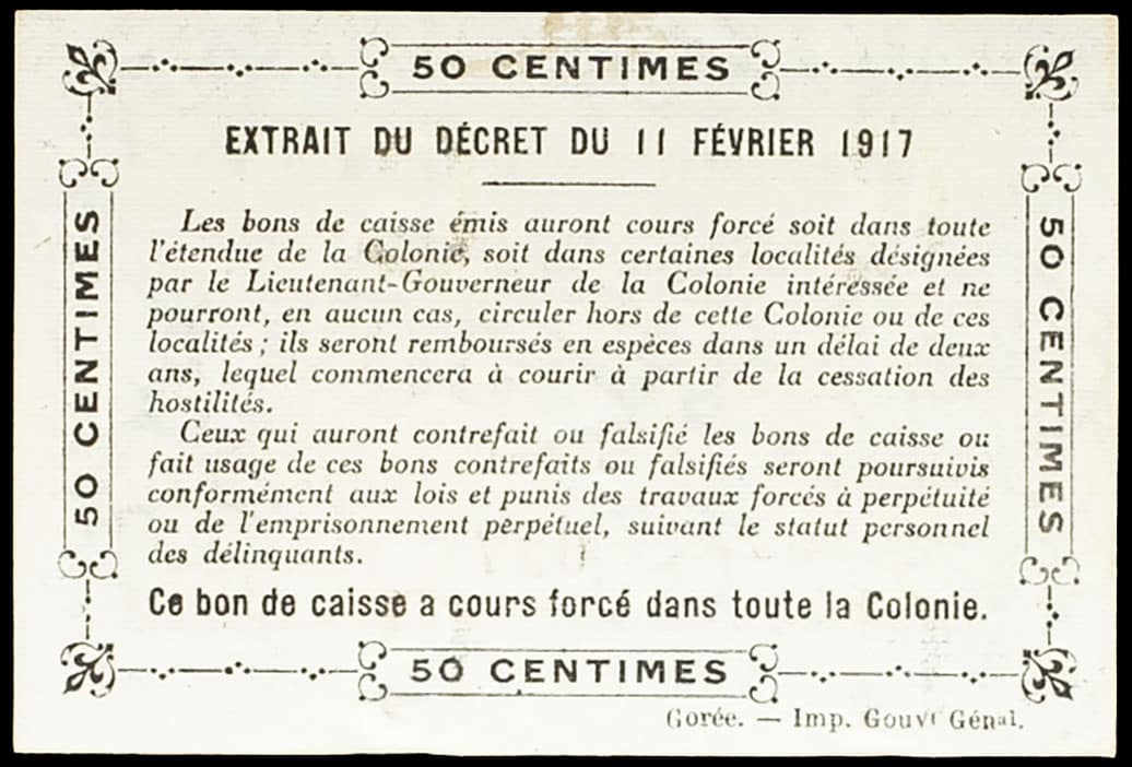 - FRENCH WEST AFRICA 0,50 franc / 50 centimes type “bleu” - Colonie du Sénégal, Gouvernement général de l’A.O.F. 11 février 1917.