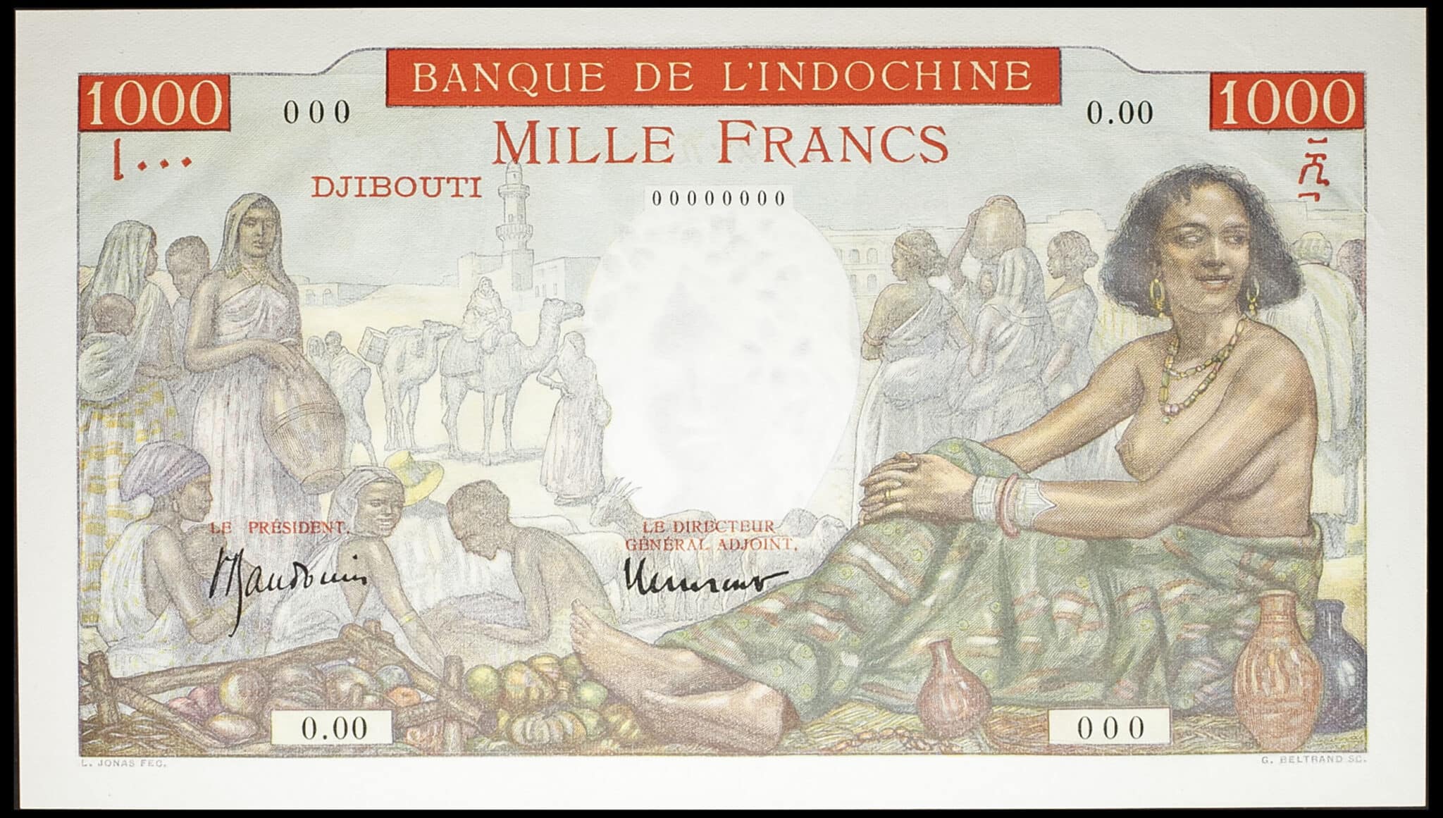 - 1000 francs, à-plats rouge (SPÉCIMEN) - Banque de l’Indochine ND (1938).
