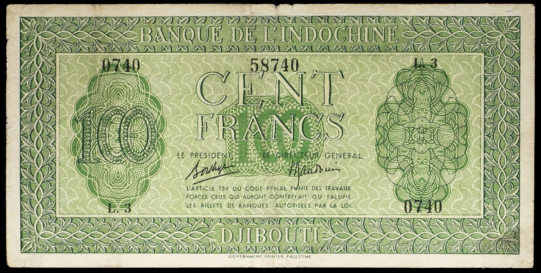 - 100 francs, impression Palestine - Banque de l’Indochine ND (1945).