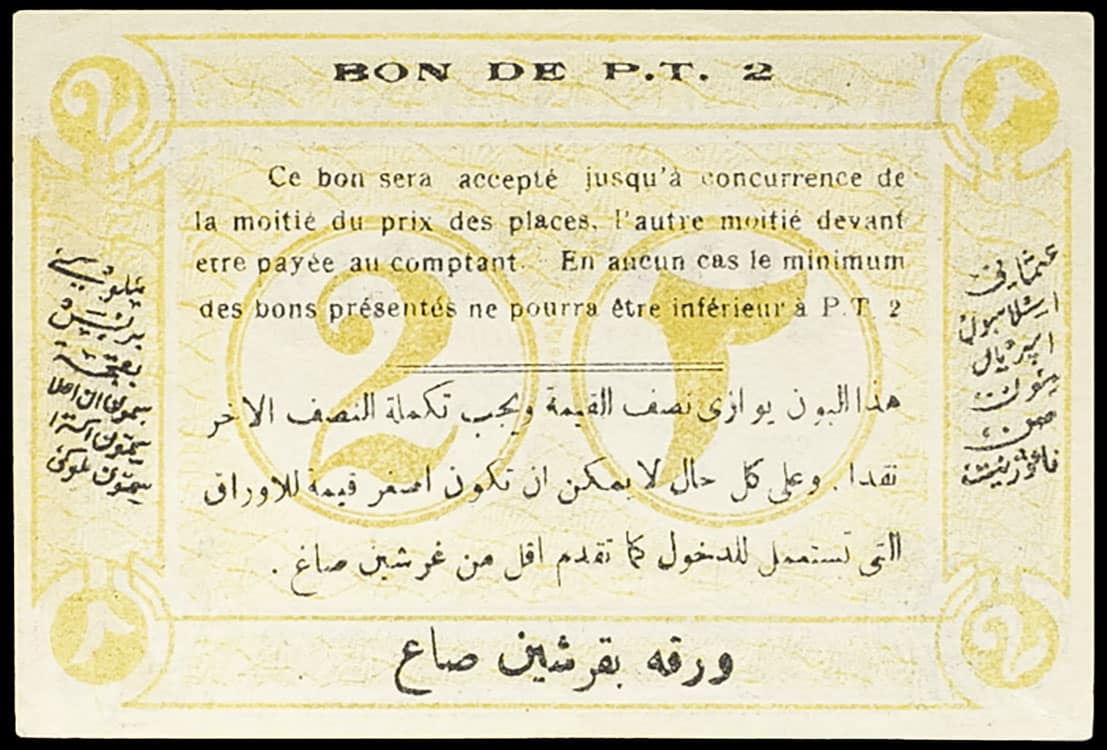Pas de série ni de numéro. Valeur de 2 P.T. pour ce bon qui était utilisé comme monnaie au début du XXe siècle en Égypte. À noter que la Société Anonyme “Matossian Tabacs & Cigarettes” a produit différents exemplaires, avec différentes dénominations pour différents types de transactions de la vie quotidienne des égyptiens (journaux, transports, spectacles ou achats divers).