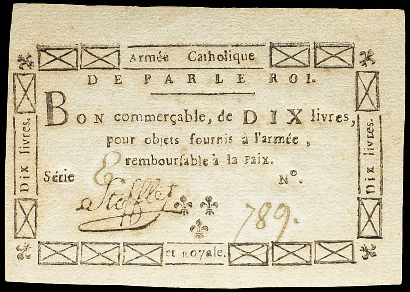 - Bon de 10 livres type “Armée Catholique et Royale” ND (1794).