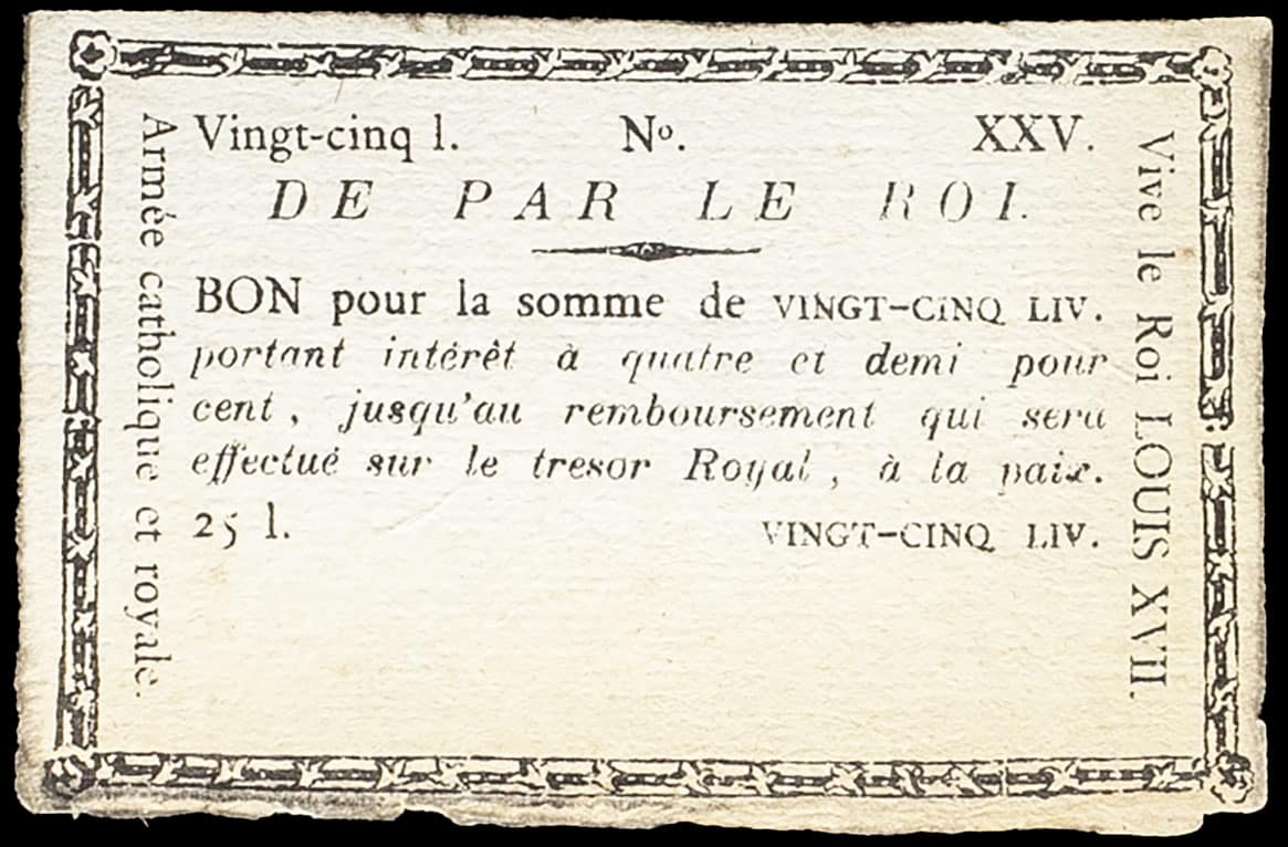 - Bon de 25 livres type “Armée Catholique et Royale”, faux d’époque ND (1793).