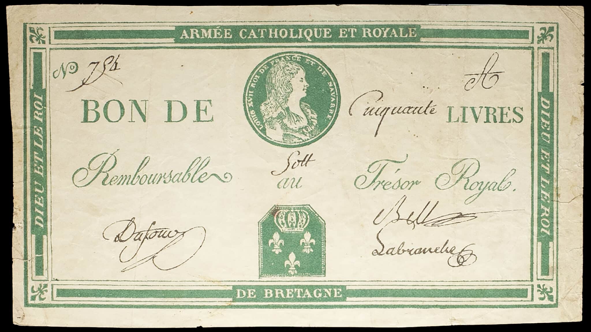 - 50 livres type “Armée Catholique et Royale de Bretagne”, faux ancien ND (1794).