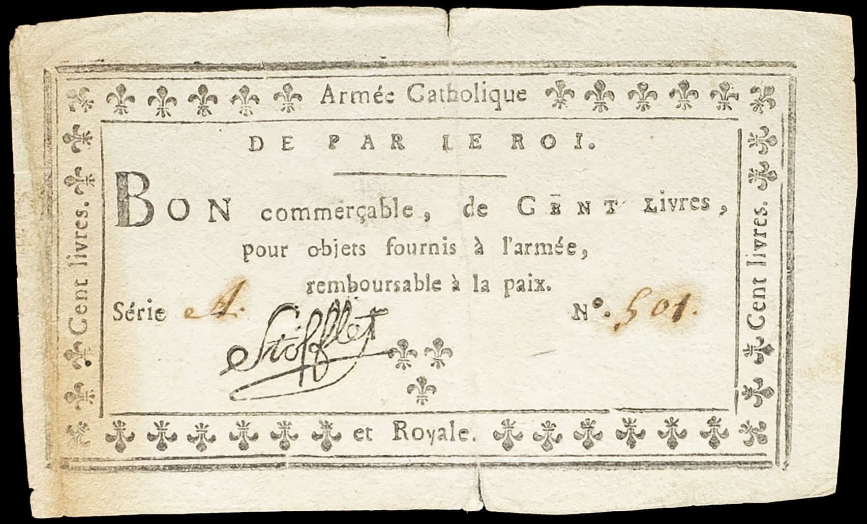 - Bon de 100 livres type “Armée Catholique et Royale” ND (1794).