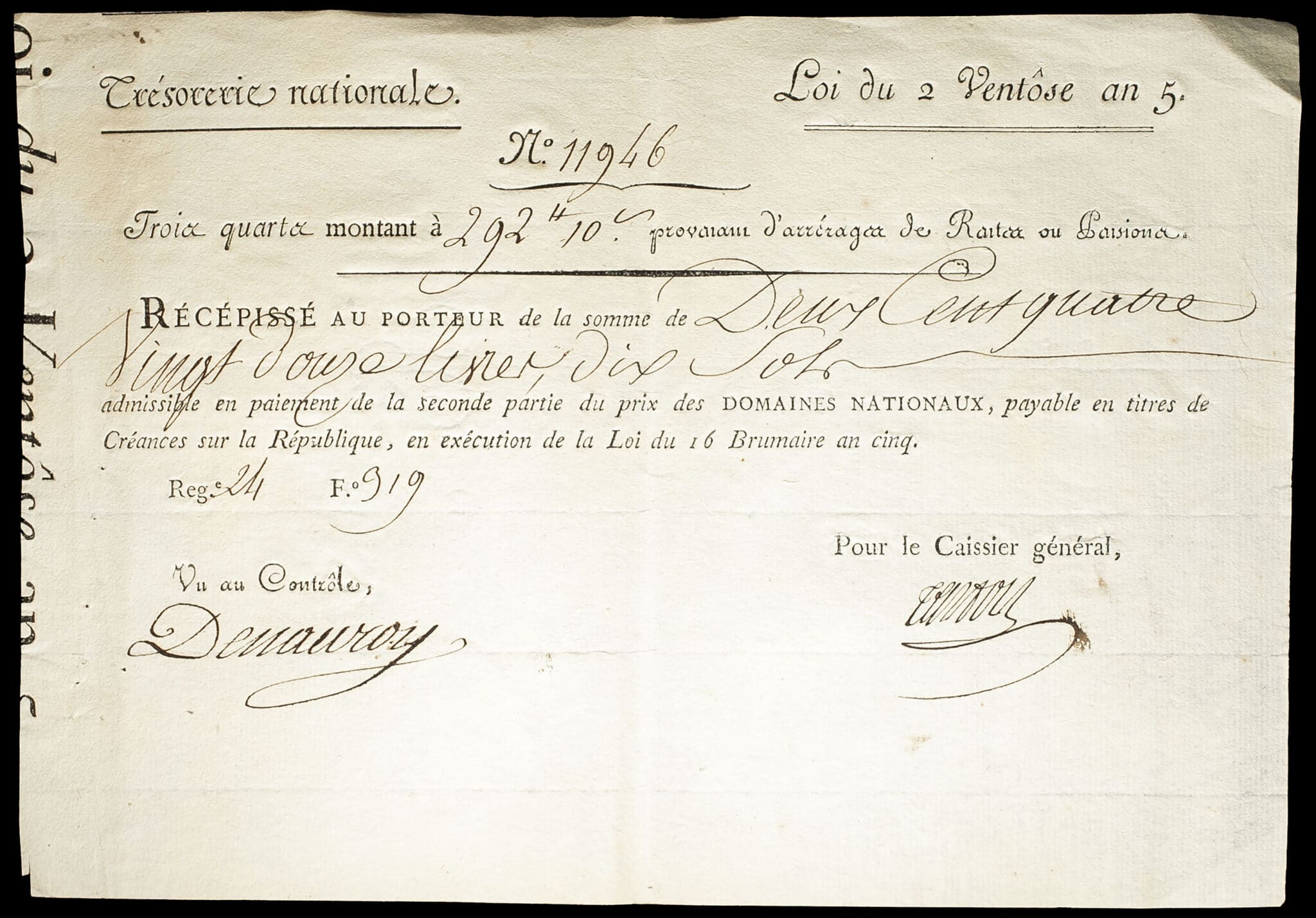 - Bon des Trois-Quarts de 292 livres 10 sols type “Trésorerie Nationale” ND (1796-1798).