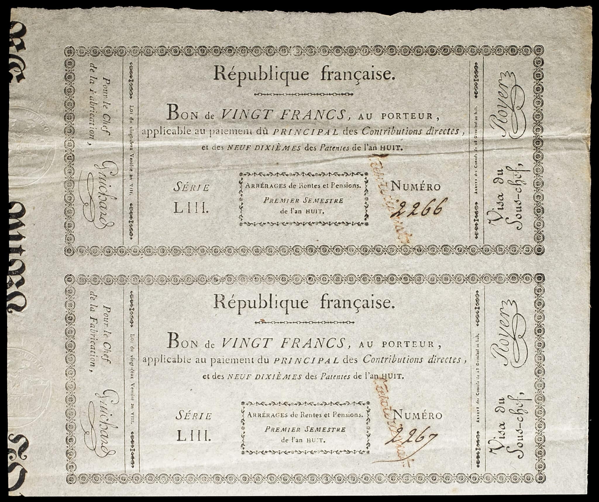 - Planche de bon au porteur de 20 francs (2), Contributions directes et des neuf-dixièmes de Patentes 28 Germinal an 8.