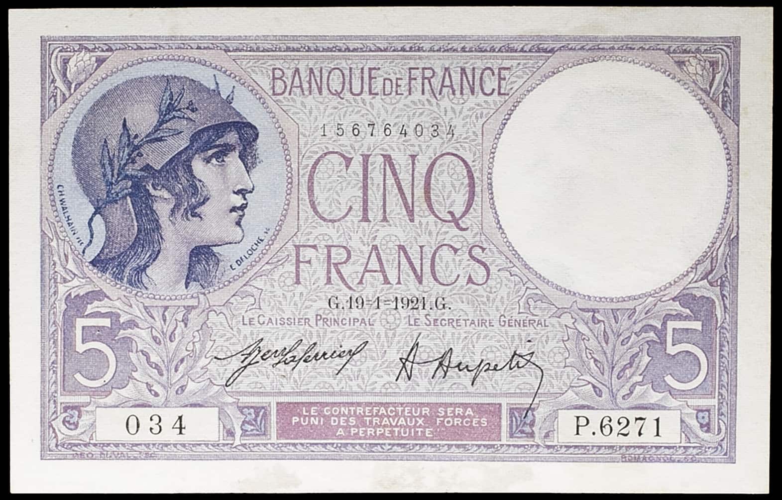 - 5 francs type “femme casquée” dit “violet” 19-1-1921.