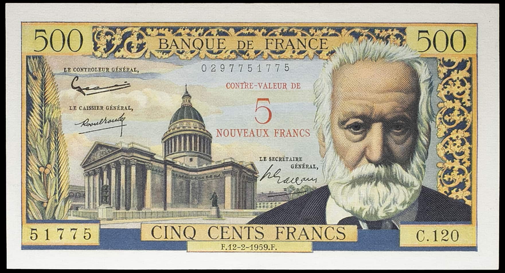 - 5 nouveaux francs surchargé sur 500 francs type “Victor Hugo” 12-2-1959.