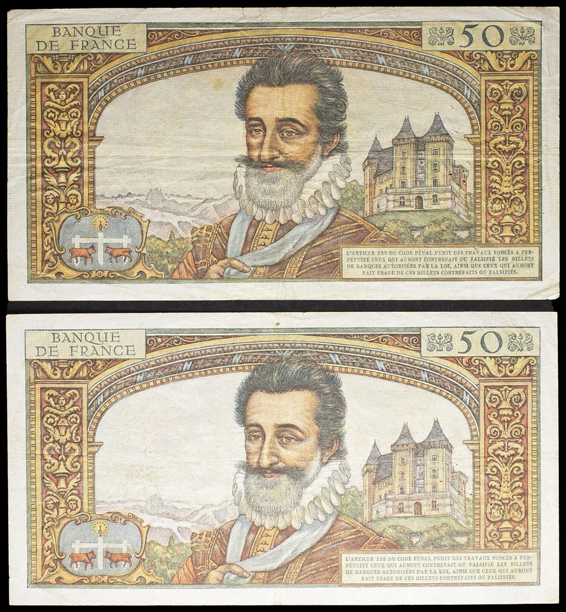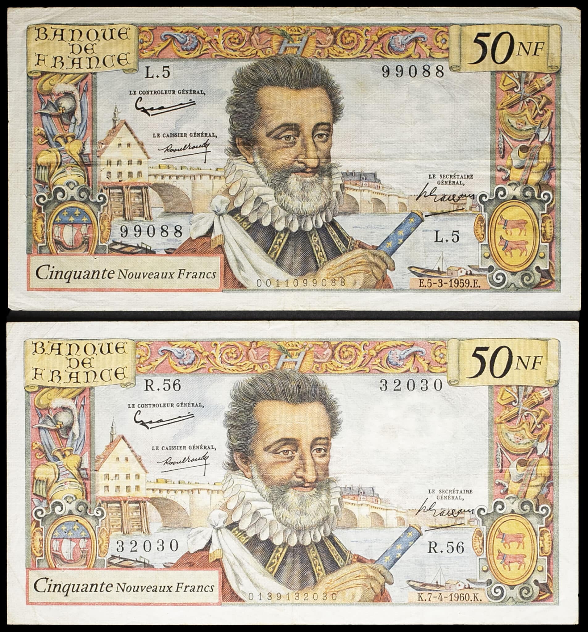 - Lot (2) - 50 nouveaux francs type “Henri IV” 5-3-1959 et 7-4-1960.