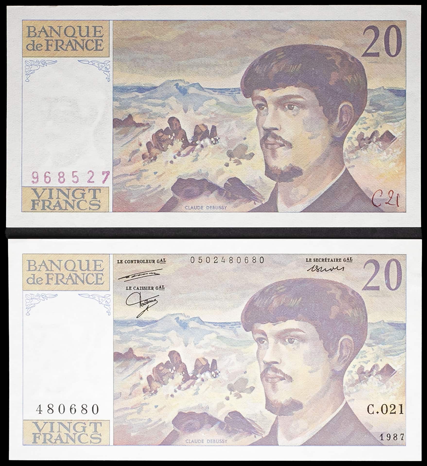- Lot (2) - 20 francs type “Claude Debussy” modifié FAUTÉ / ERROR sans numéros, signature ni date 1987.