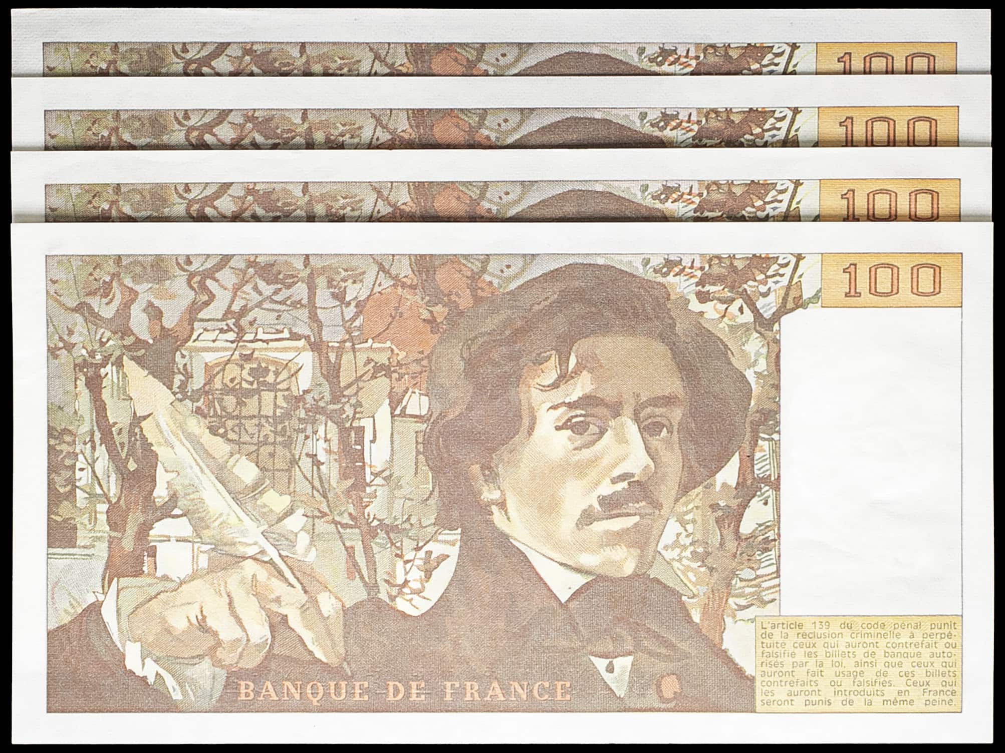 - Lot (4) - 100 francs type “Eugène Delacroix” FAUTÉ / ERROR avec défaut d’impression 1986.