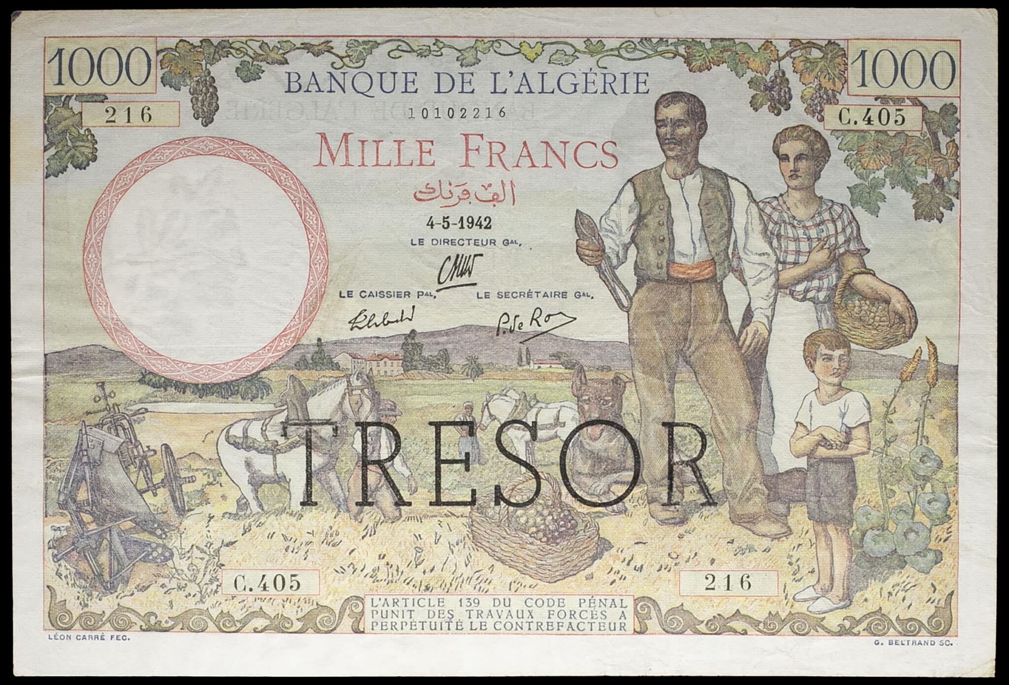- 1000 francs type “famille de cultivateurs” (Banque de l’Algérie) surchargé “TRÉSOR” 4-5-1942.