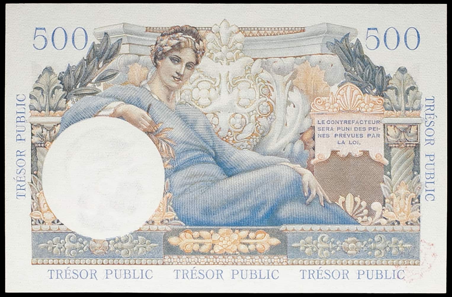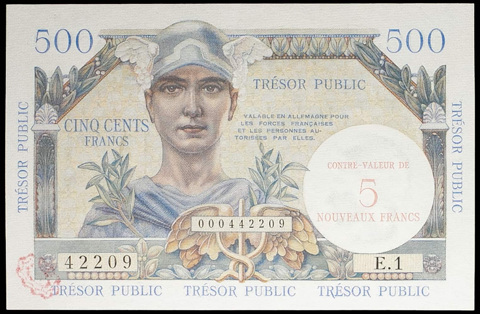 - 5 nouveaux francs surchargé sur 500 francs type “Trésor Public” ND (1960).