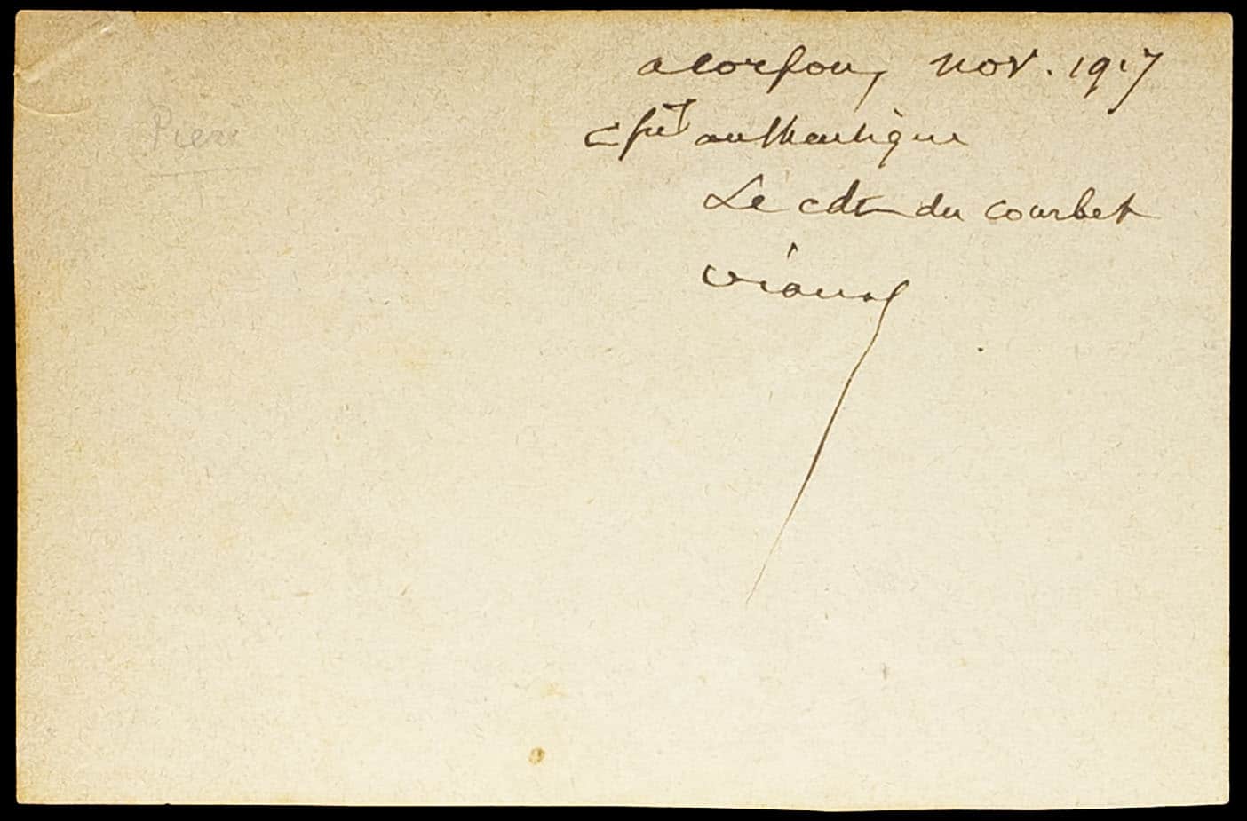 Sans alphabet ni numéro. Signature du lieutenant de vaisseau chargé de la coopérative. Au verso, note manuscrite de la plume du commandant du navire Louis-Gabriel Viaux (mars 1916-1918) : “À Corfou, nov. 1917 [...]”. À ce jour, c’est le premier exemplaire présenté lors d’une vente aux enchères ! Un seul autre exemplaire est connu et illustre le livre de Maurice Kolsky (”Le papier-monnaie de sièges et de campagnes de l’armée française”).