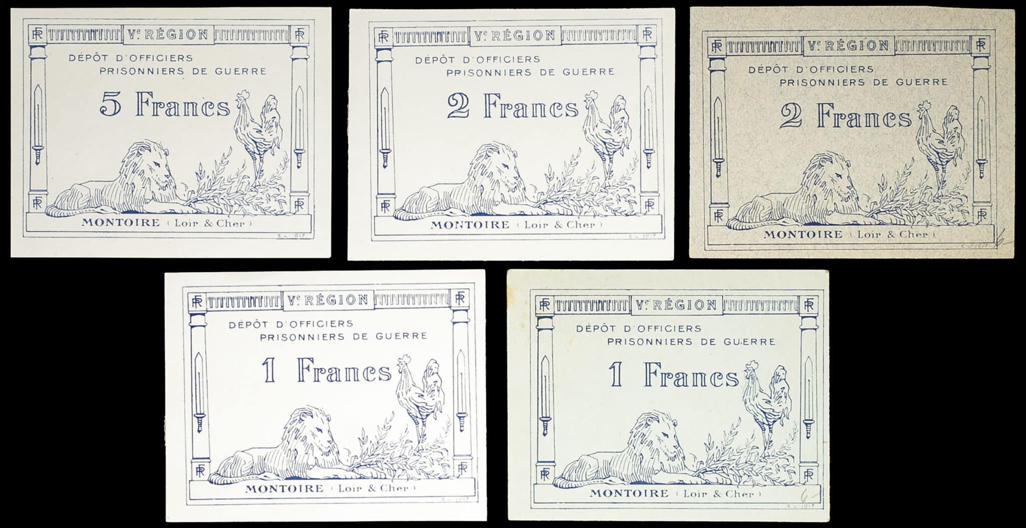 - Lot (5) - Bon de 2 x 1 franc, 2 x 2 francs et 1 x 5 francs type “Dépôt d’Officiers Prisonniers de Guerre” - Montoire 1917.