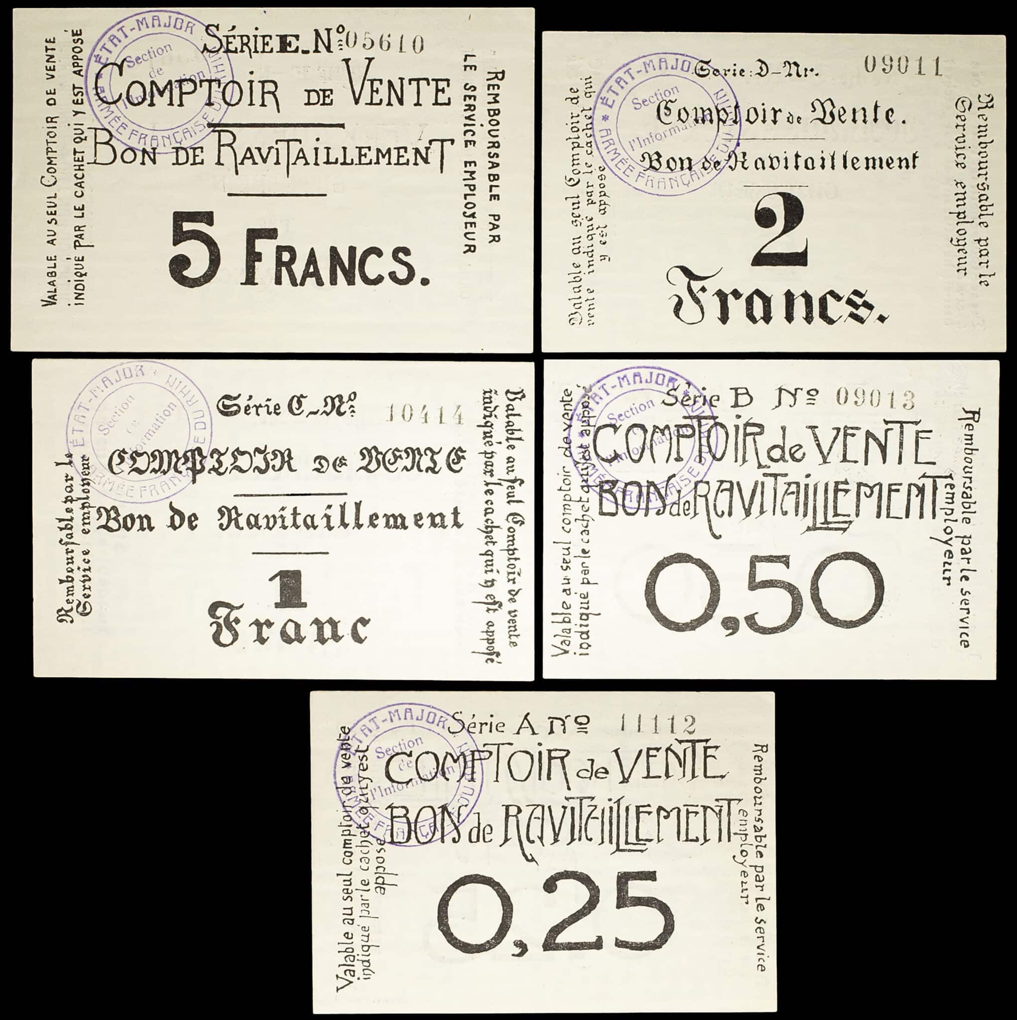 - Lot (5) - Bon de ravitaillement de 25 centimes, 50 centimes, 1 franc, 2 francs et 5 francs type “Armée française du Rhin” ND (1919-1930).