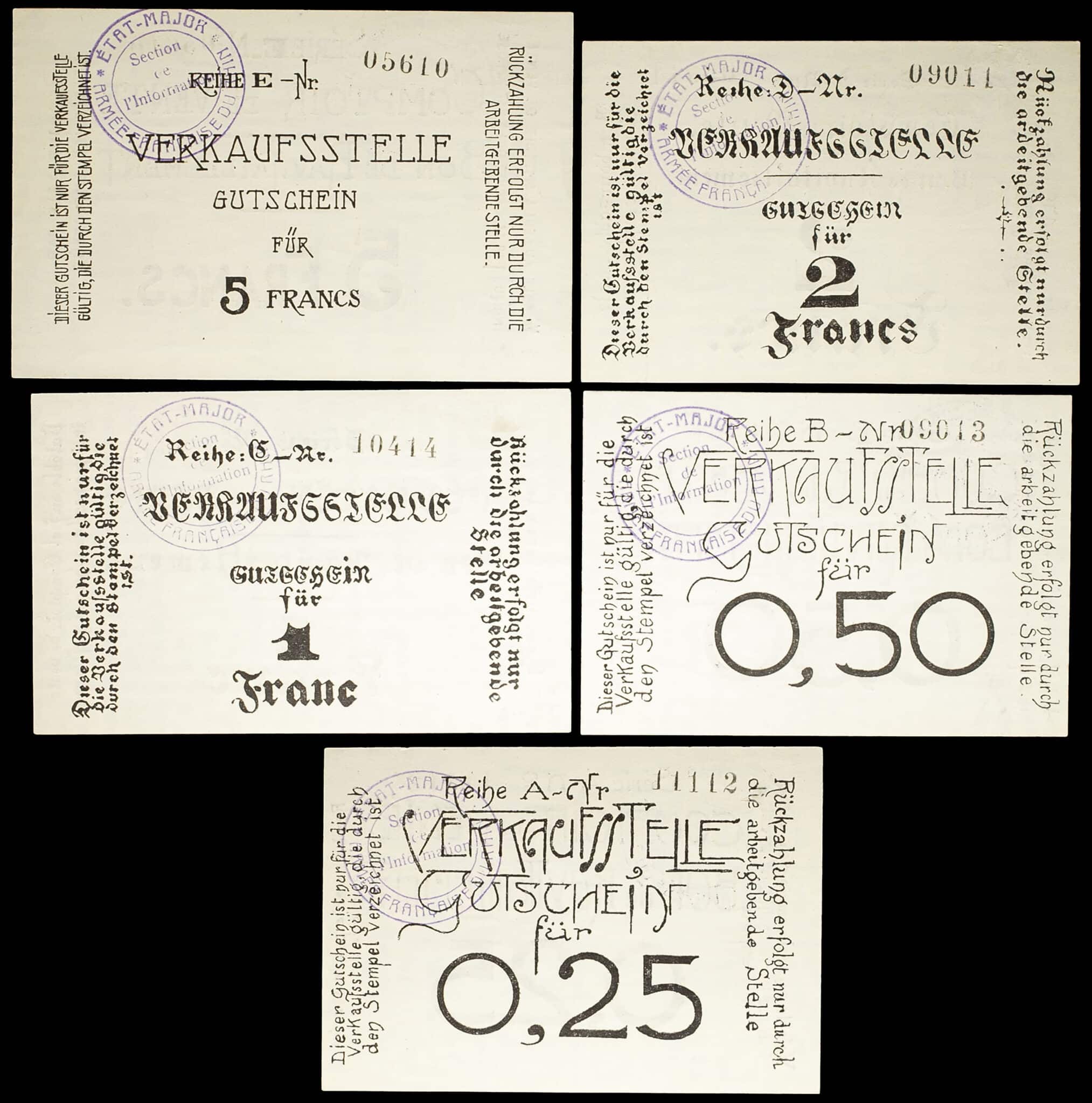 Lot de 5 billets en double langue français et allemand. Lot composé des : 25 centimes série A - numéro 11112, 50 centimes série B - numéro 09013, 1 franc série E - numéro 10414, 2 francs série D - numéro 09011 et 5 francs série E - numéro 05610.