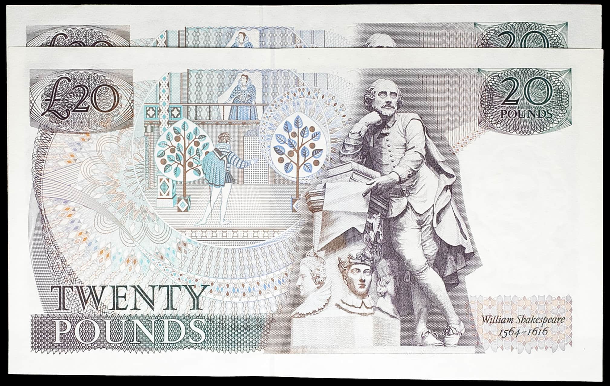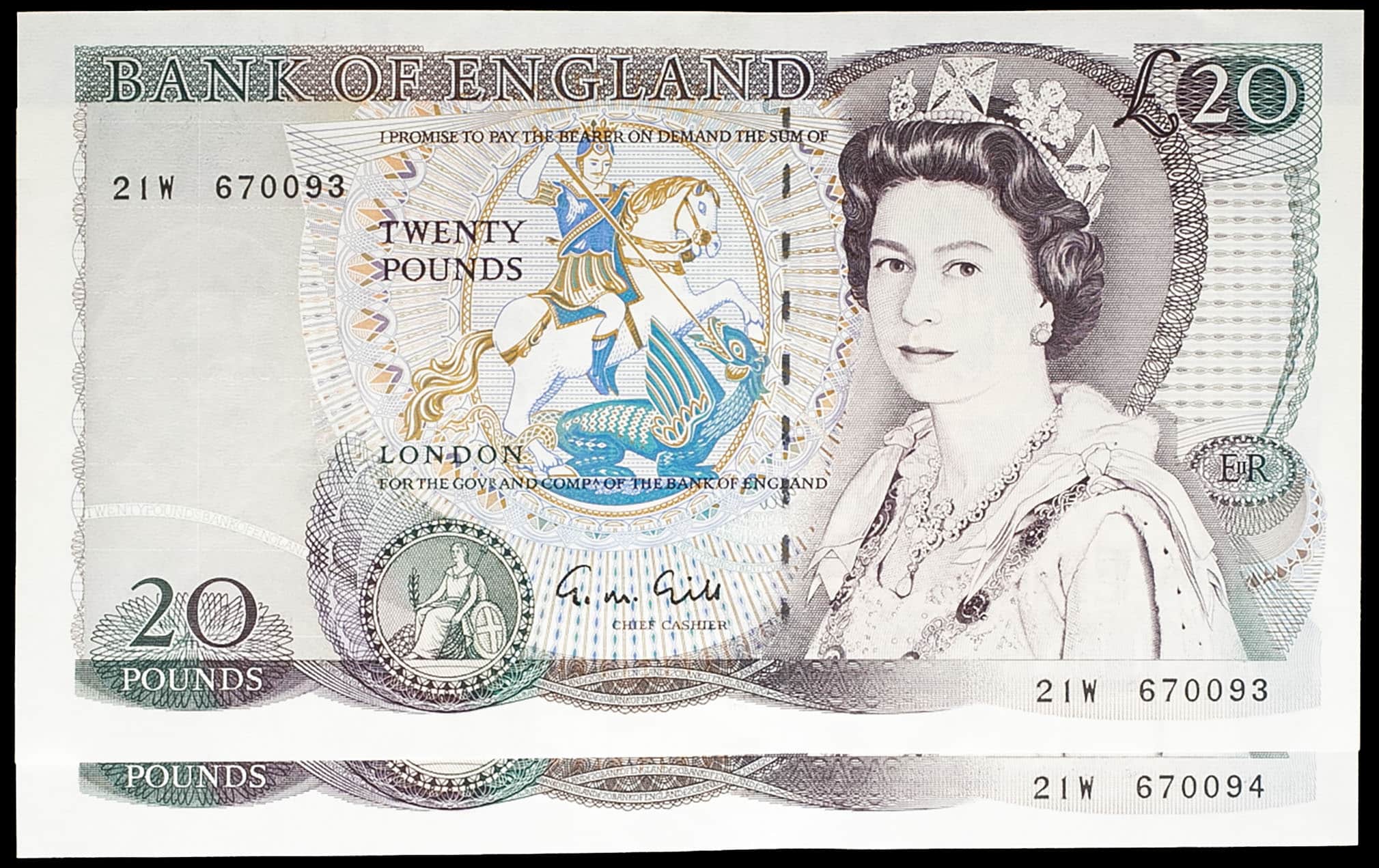 - UNITED KINGDOM Lot (2) - 20 pounds avec le portrait de la reine Élisabeth II avec numéros consécutifs ND (1988-1991).