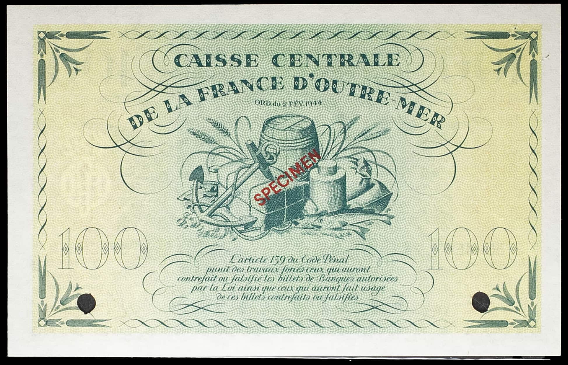 - 100 francs type “Marianne” dit “Edmond Dulac” (SPÉCIMEN) - Caisse centrale de la France d’outre-mer 2 février 1944 (31 mai 1946).
