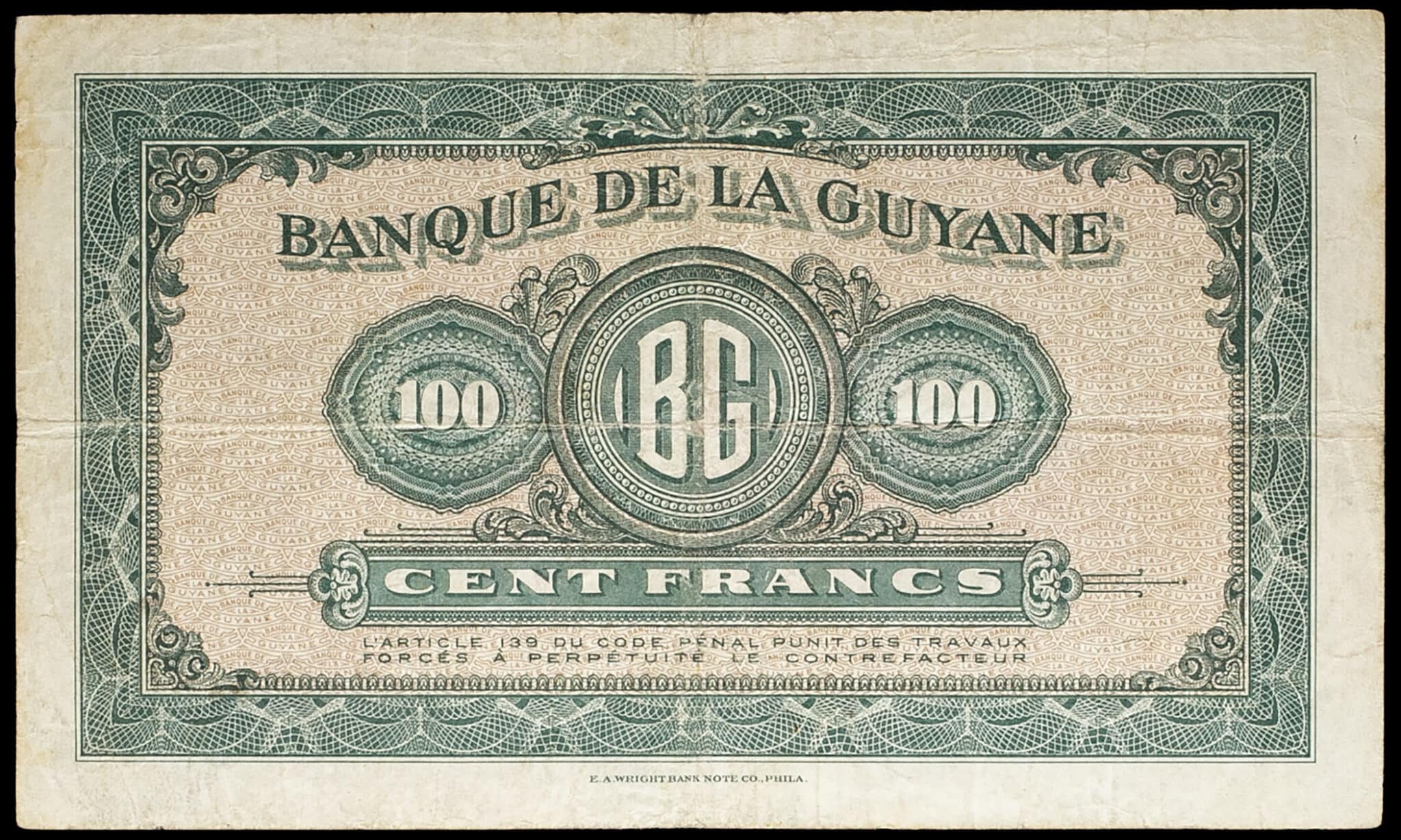 - FRENCH GUIANA 100 francs impression US type “carte” ND (1945).