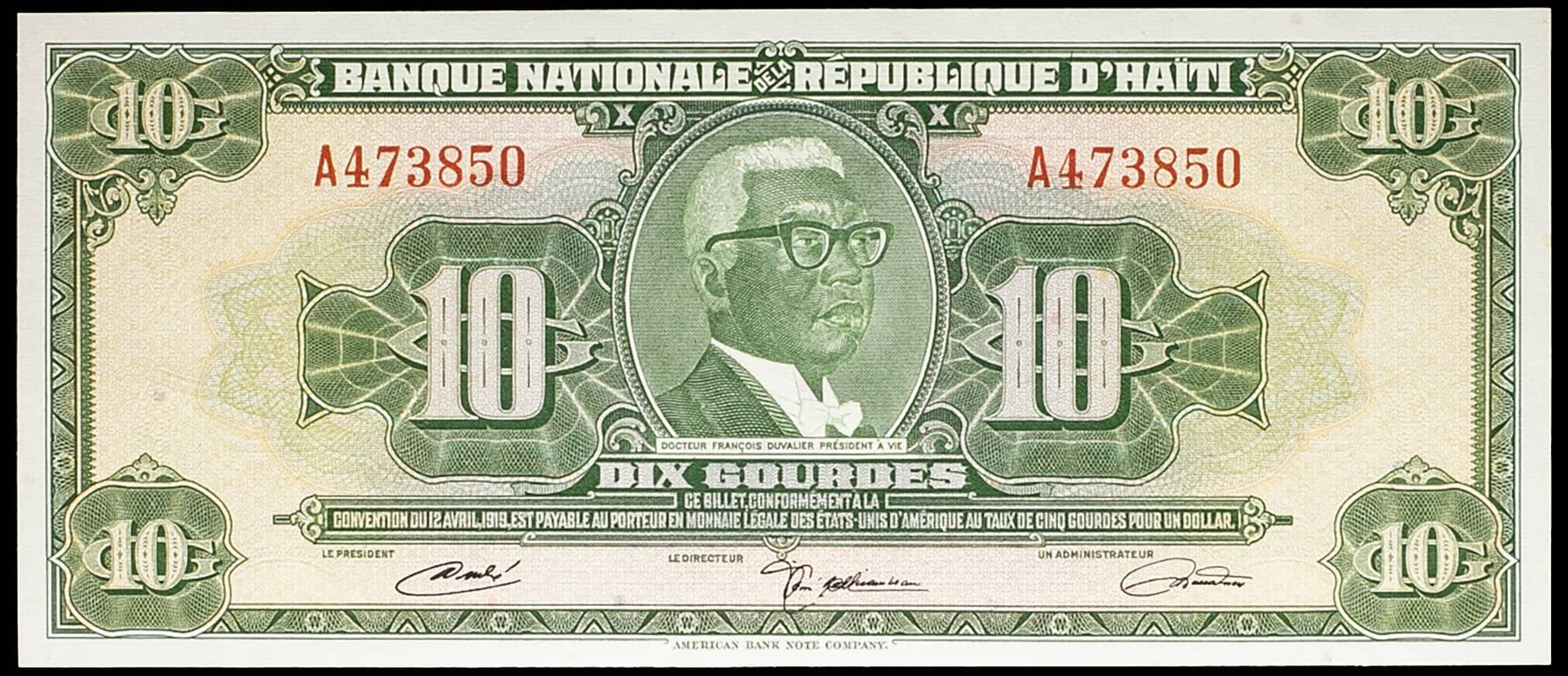 - HAITI 10 gourdes avec le portrait du président François Duvalier ND (1971).