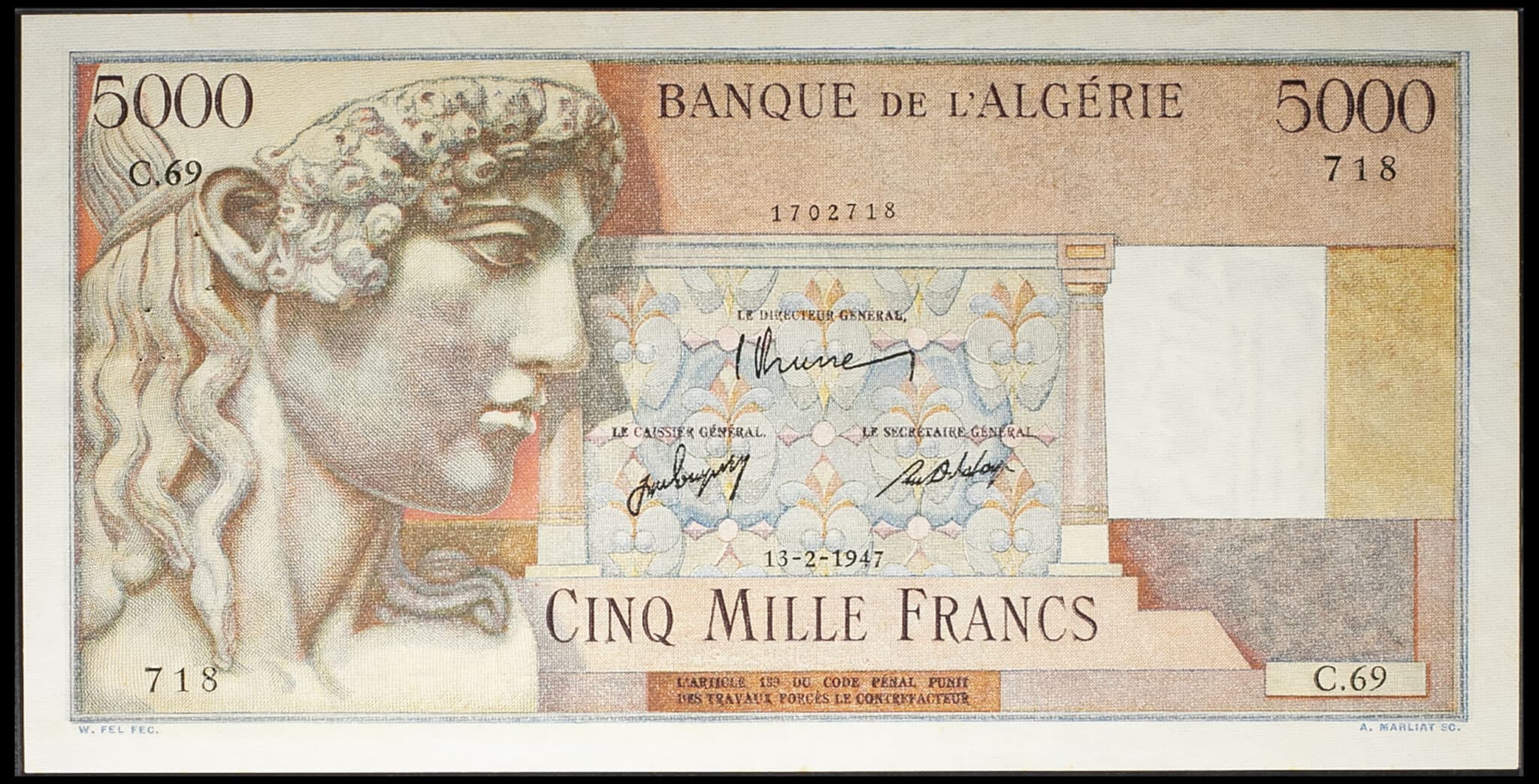 - ALGERIA 5000 francs type “Apollon” 13-2-1947.