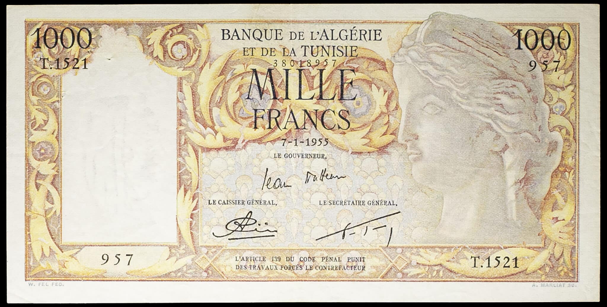 - ALGERIA 1000 francs type “Isis” modifié 7-1-1955.